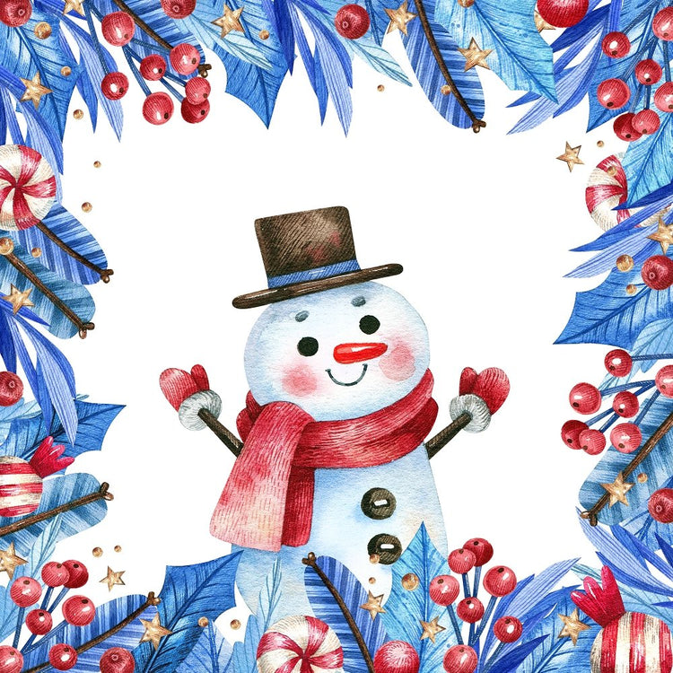 Snowman in a Framed Wreath Fabric Panel - Blue Details