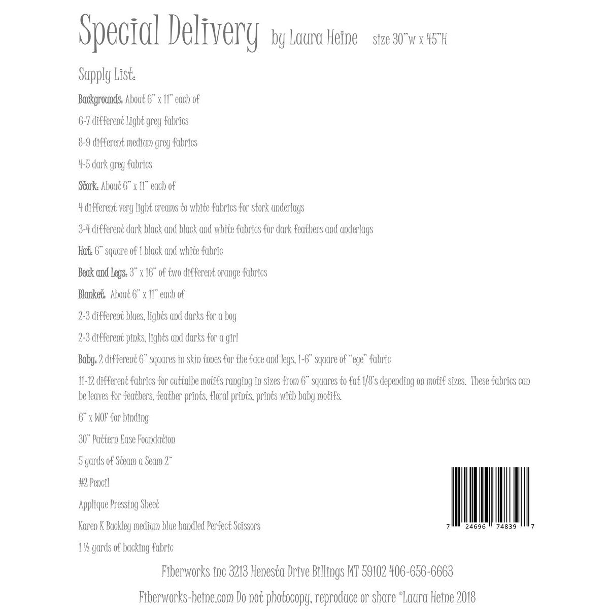 Special delivery! This adorable quilt pattern, designed by Laura Heine for Fiberworks, features a stork delivering a baby. Customize your quilt by choosing your desired fabric color. The Pattern includes step-by-step instructions and full-color images. Finished quilt measurements 30in by 45in.