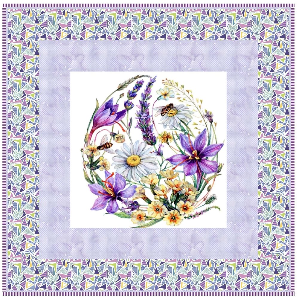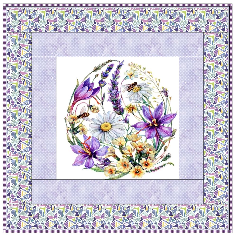 The Spring Wildflower Easter Egg Wall Hanging includes everything that you need to make the quilt - the instructions and a total of 3 1/2 yards of fabric and a 23" panel. It has two borders and is finished with a flange binding. Batting is sold separately. The finished size of this quilt is 42" x 42".