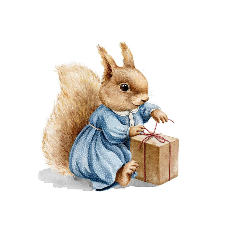 The Squirrel In Dress Opening Present Fabric Panel is a part of the Christmas Little Critters Fabric Collection printed by Sew Creative Fabrics. This panel is digitally printed on 100% cotton. The fabric panel is available in 6 different sizes: