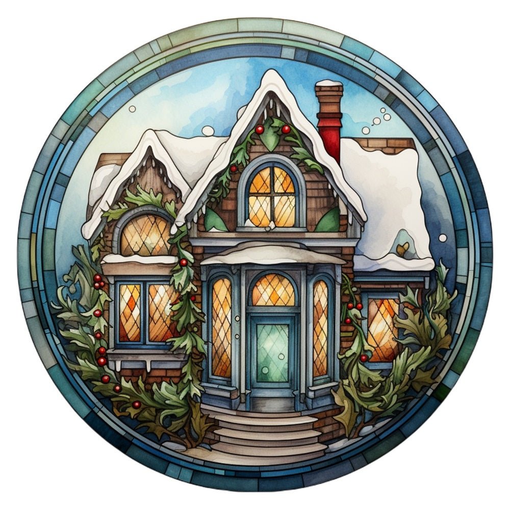 Stained Glass Christmas Cottage #2 Fabric Panel