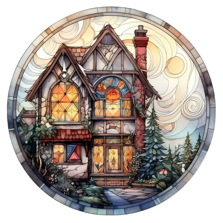 Stained Glass Christmas Cottage #5 Fabric Panel