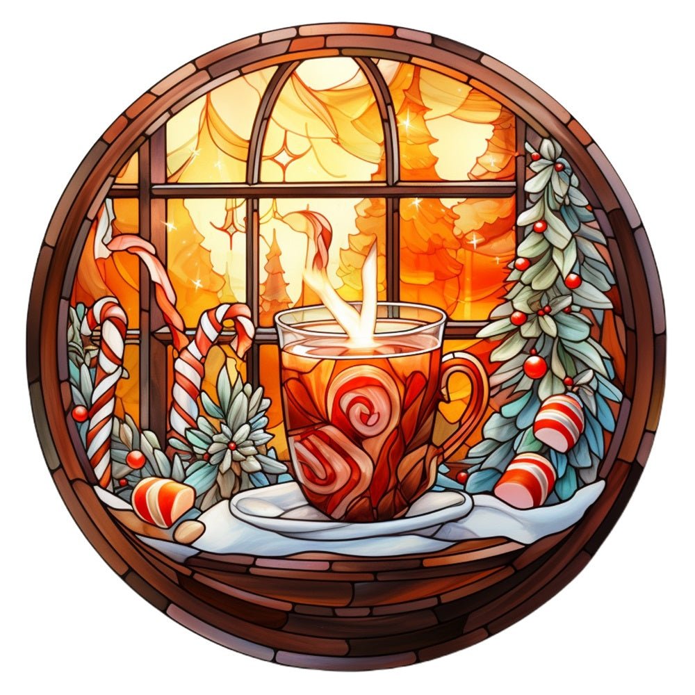 The Stained Glass Peppermint Coffee Fabric Panel is part of the Christmas Stained Glass Ornaments Fabric Collection printed by Sew Creative Fabrics. Digitally Printed on 100% cotton. This panel is available in 6 different sizes: