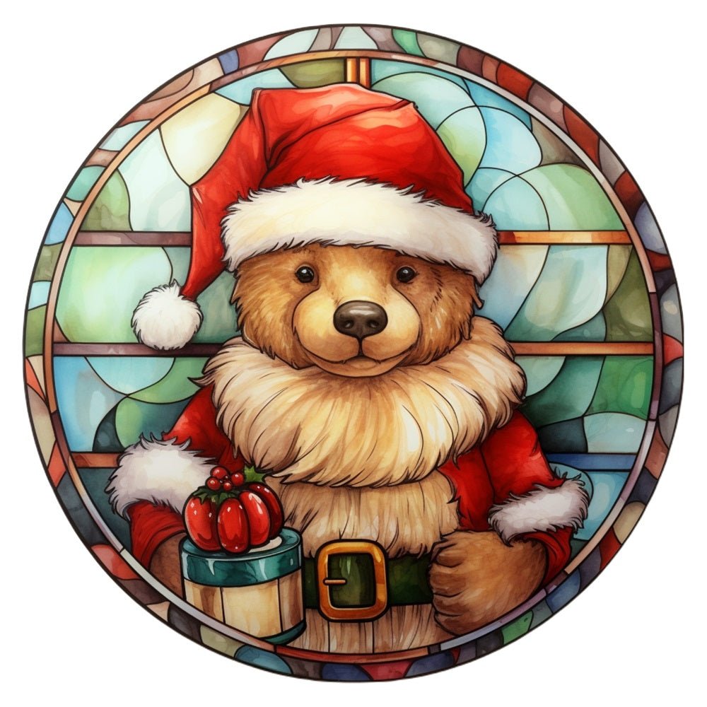 Stained Glass Santa Bear with Present #1 Fabric Panel