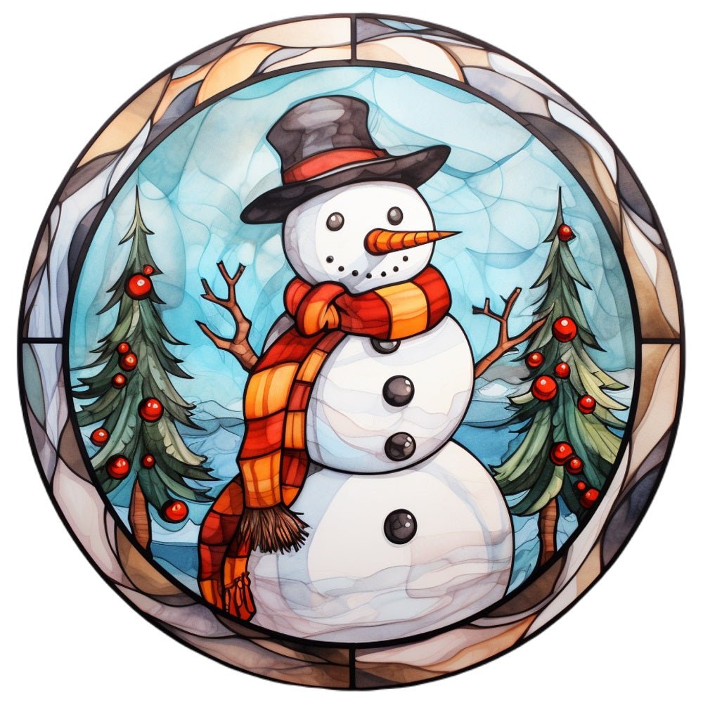 Stained Glass Snowman with Scarf Fabric Panel Details