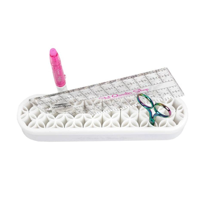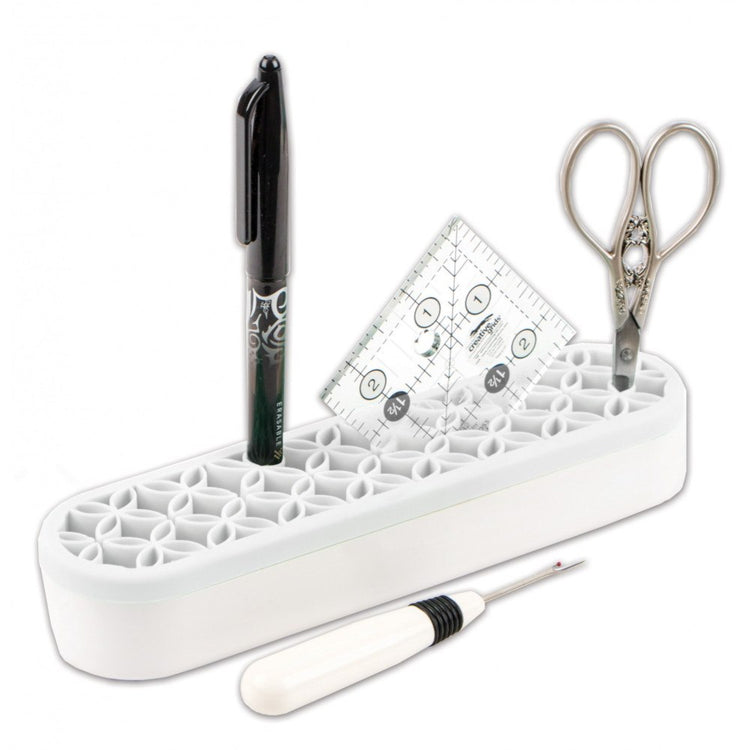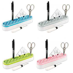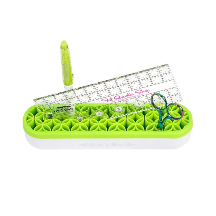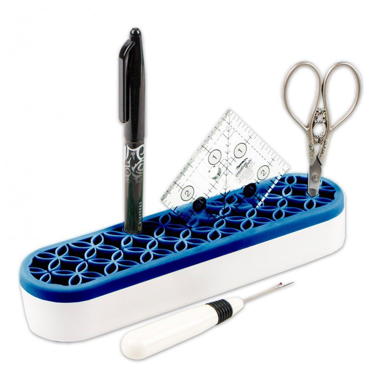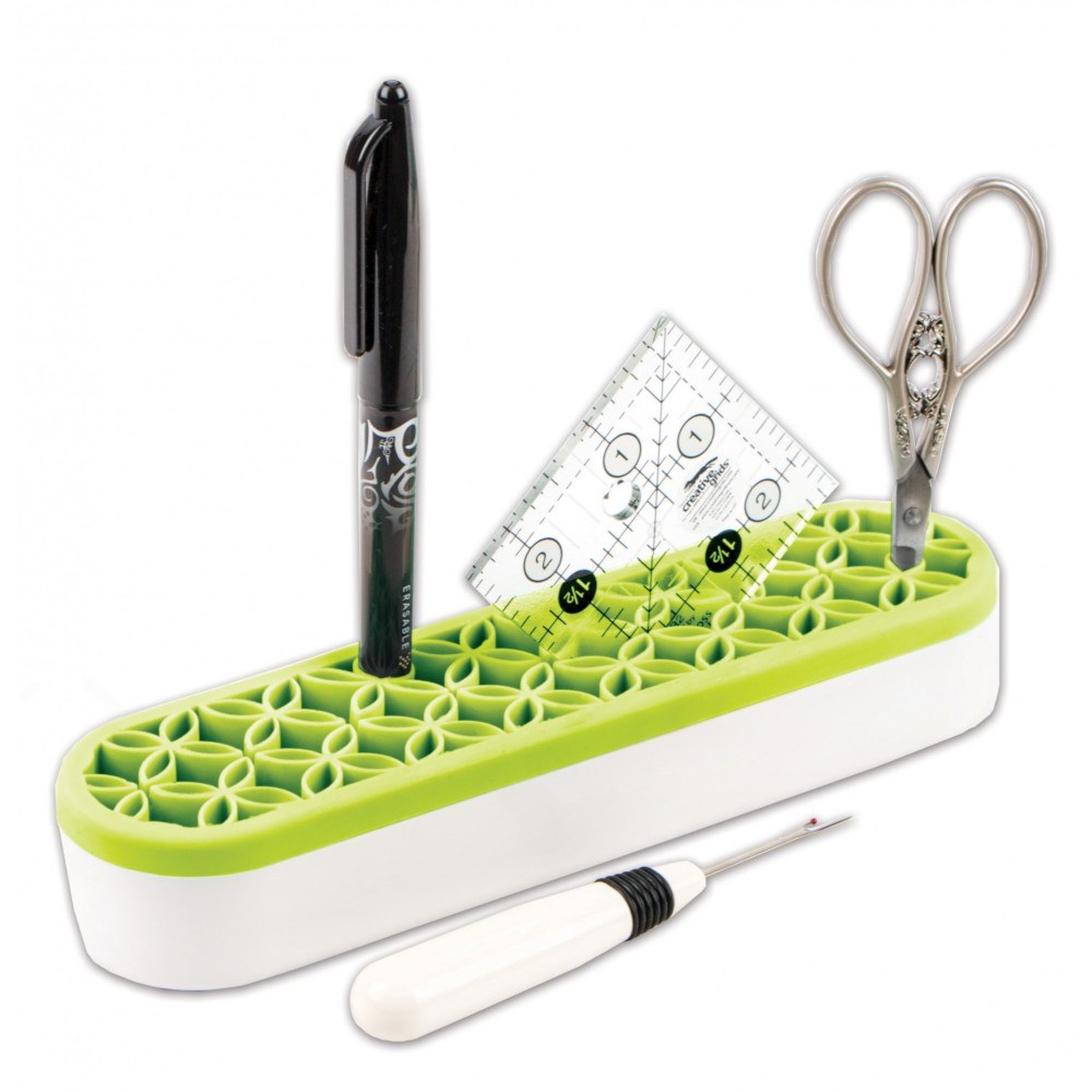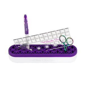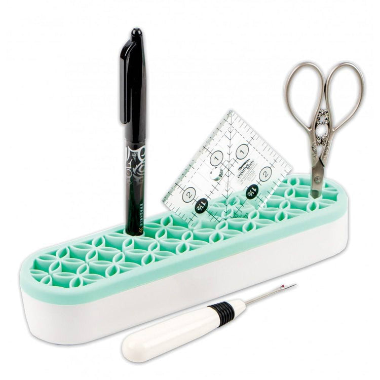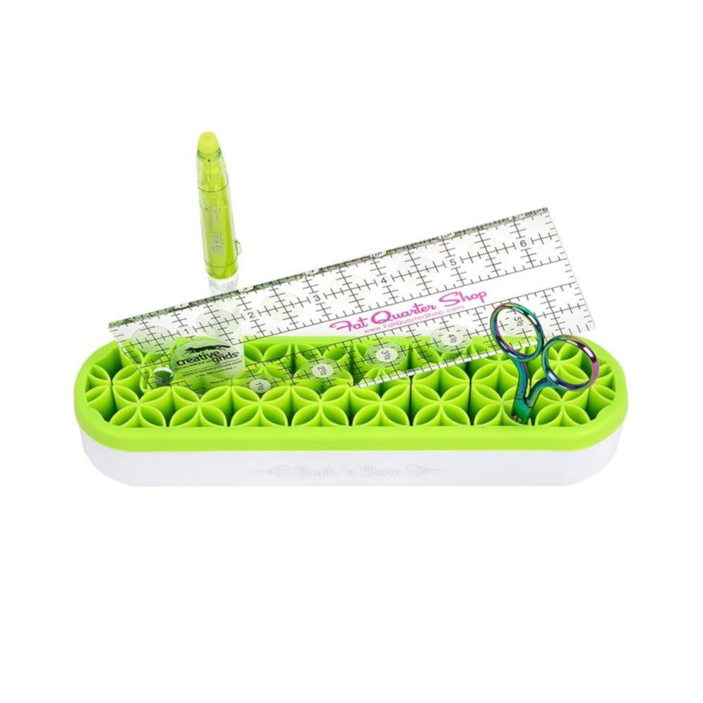 The Stash n Store Organizer is the perfect tool to keep your notions organized. This handy storage device fits easily on any surface or workstation. The silicone interior features large and small pockets that stretch to accommodate a variety of notions and can be easily cleaned. Multiple colors available: Aqua, Gray, Mint, Navy, Pink, Red, Purple, White, and Lime.