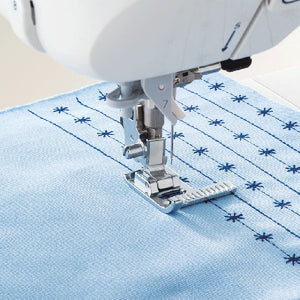 Juki's Presser Foot with Guide, or Stitch Guide Foot, is perfect when sewing parallel, straight or decorative stitches. To the right of the presser foot, there are guidelines at a 2mm spacing from 0cm to 2cm from the center needle position.