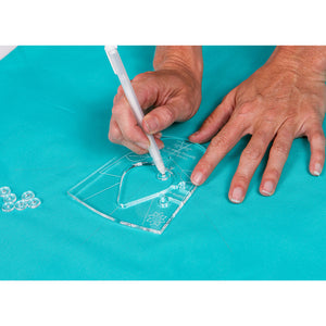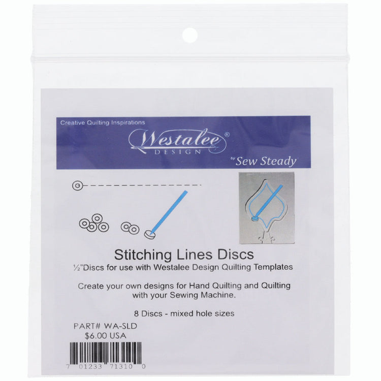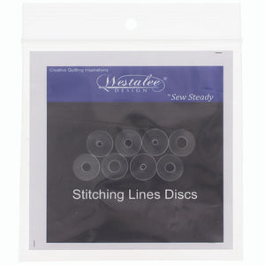 Stitching Line Discs are small circles used to trace quilting rulers and templates onto fabric before machine or hand quilting. This package of Stitching Line Discs includes two each of four different sizes. Place your template or ruler onto the fabric to be quilted. Using your favorite marking tool, place the tip through the Stitching Line Disc and trace your template or ruler. Stitching Line Discs make perfect 1/4 inch lines that are then used as guidelines for quilting. Templates and rulers are sold separately.