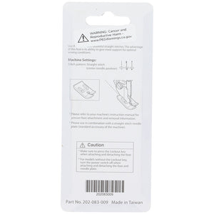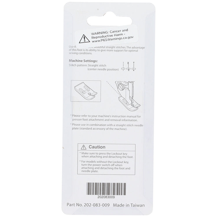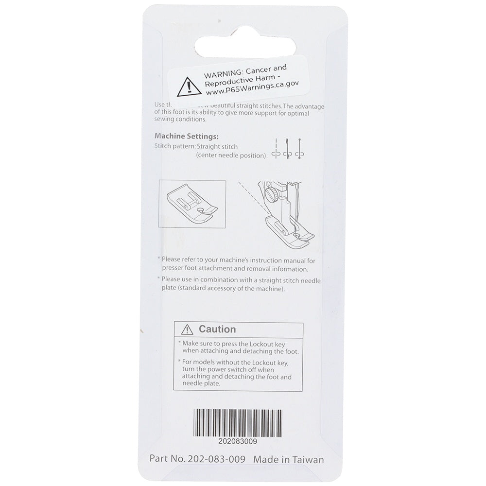 The small needle hole of this foot prevents lightweight fabric from "buckling" and causing puckering or skipped stitches. It is also ideal for sewing very narrow seams.