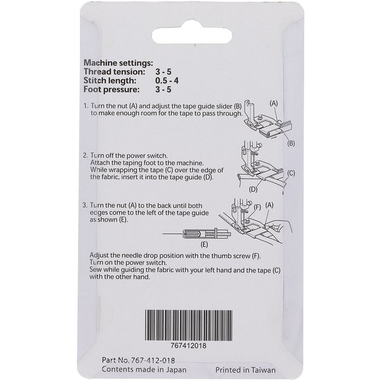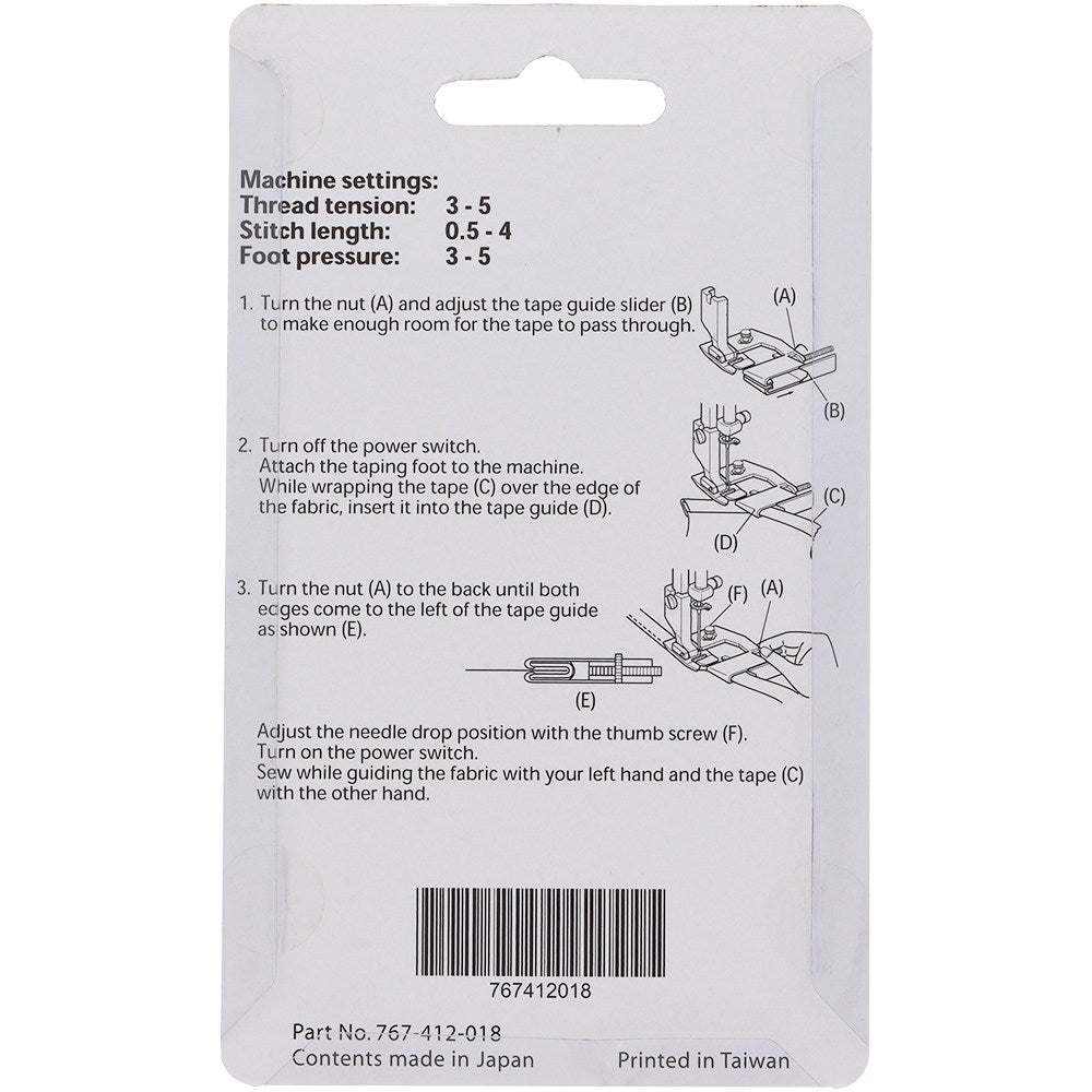 Use this foot for attaching tape to the edge of fabrics. Adjust the needle drop position with the thumb screw. Guide the fabric with the left hand and tape with the right hand.