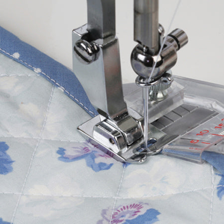 The Taping Foot helps to feed seam tape binding when sewing garments in knit or stretch fabric. Use it on shoulder seams and armholes to prevent stretching. The foot can also be used to attach bias tape. The measuring hatch marks help make an accurate binding width, from 5mm to 20mm.