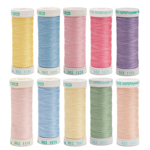 Sulky's 10-piece Poly Decor Embroidery Thread Kit features an assortment of pastel colors that are ideal for spring-time or baby-themed projects. Use this thread set when appliqueing, piecing, or embroidering on clothes. The Poly Deco Embroidery Thread Set is a 2-ply, 40-weight thread that comes on 250-yard spools. All ten reels contain 100% polyester thread.