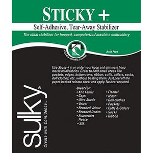 Sulky Sticky Plus is a self-adhesive, tear-away stabilizer. No heat is required with this stabilizer just peel off the paper-backed release sheet and apply. It eliminates unsightly, hard to remove hoop marks and doesn't gum up the needle when stitching.