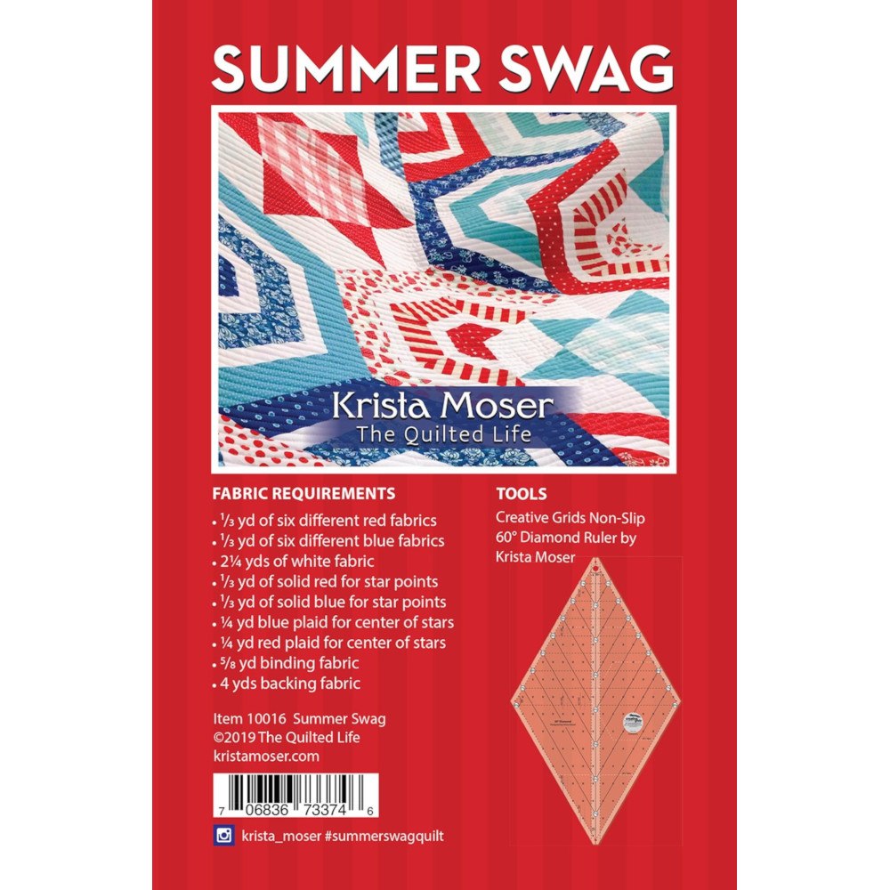 The Summer Swag Quilt Pattern by Krista Moser features large star blocks with fabric strip borders. This is a fabric roll/Jelly Roll™ friendly project. The Summer Swag Pattern included complete instructions with illustrations to guide you through every step of cutting, piecing, and assembling your quilt. The completed Summer Swag Quilt measures 65in by 81in. See images for fabric requirements. This pattern requires the use of Creative Grids 60 Degree Diamond Ruler #CGR60DIA (Sold separately.)