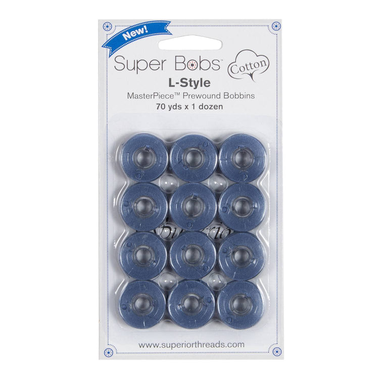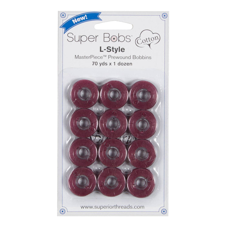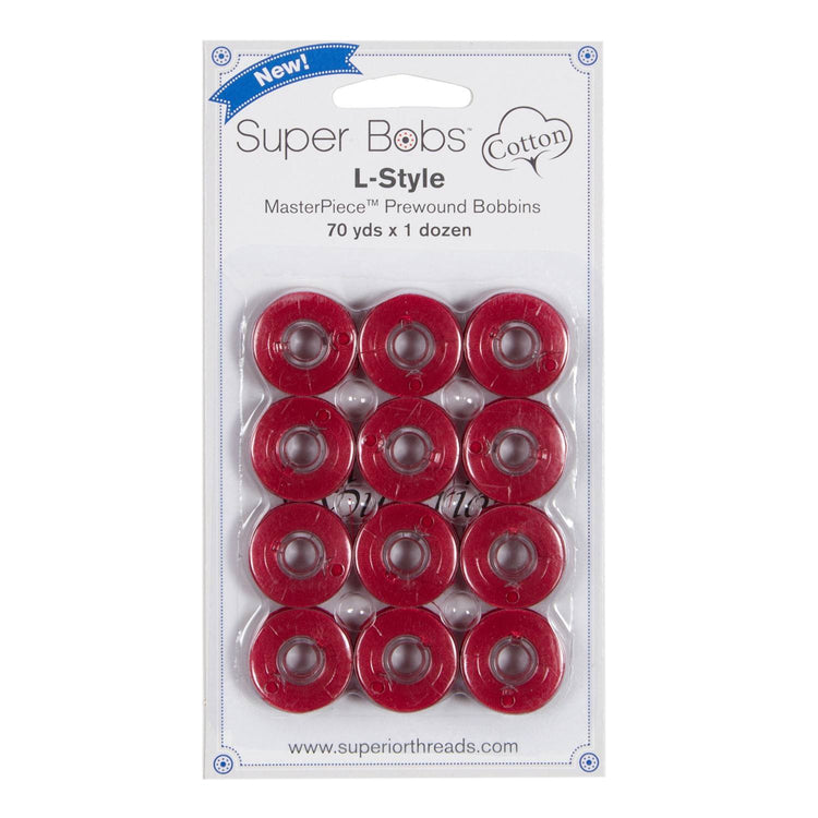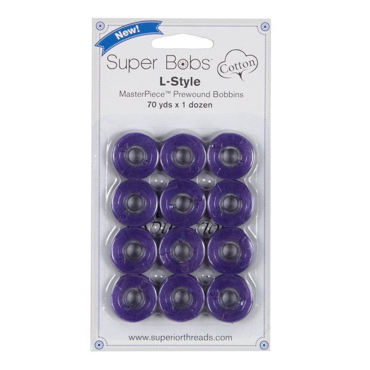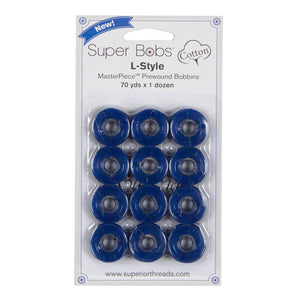 Use Super Bobs MasterPiece Prewound Bobbins in embroidery, sewing, quilting, or thread painting projects. This 12-pack of bobbins holds 70-yards of 50-weight, 2-ply Egyptian Cotton Thread. Super Bobs MasterPiece Prewound Bobbins have a uniform tension that will allow you to achieve more consistent and even stitches, giving your finished projects a more professionally finished look. These L-style plastic bobbins are reusable and available in a multitude of colors to suit any project.