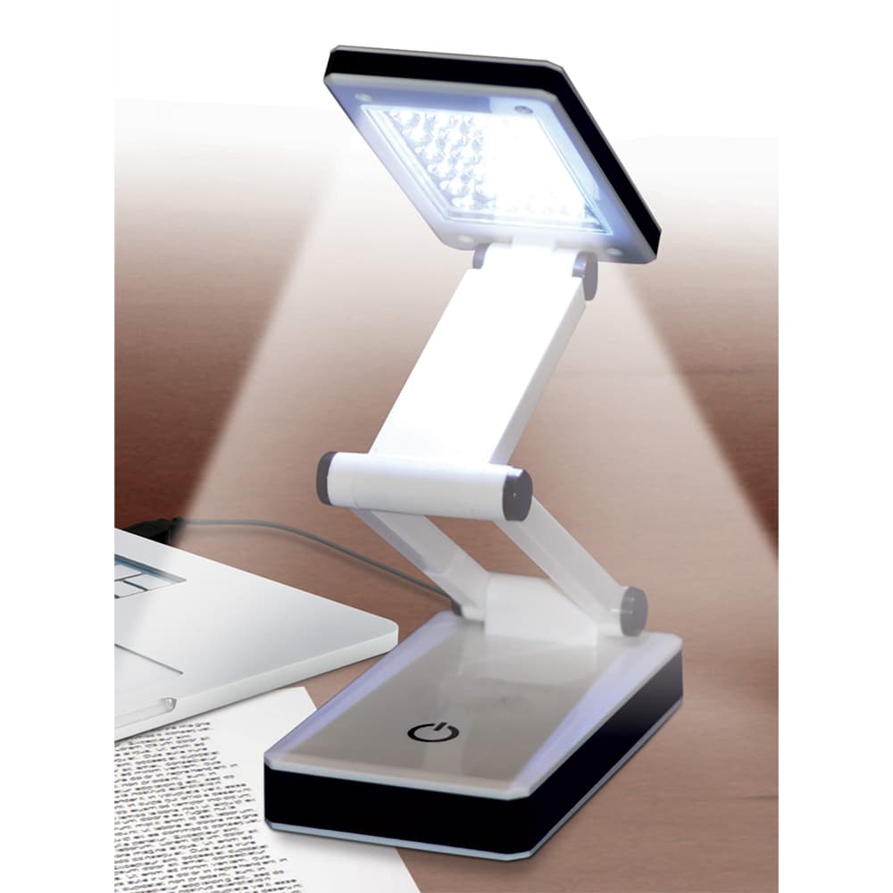 Use the Super Bright Portable LED Lamp in your office, sewing, quilting, or crafting room. The 24 LED bulbs will last thousands of hours without heating up. Adjust the brightness of the Super Bright LED Lamp to suit your eyes and projects. This foldable lamp extends to approximately 9-1/2" and folds flat to 5" by 3" by 2". This small, slim light is great for travel and can be operated with batteries or a USB connection. The USB cable is approximately 3-1/2 feet long.