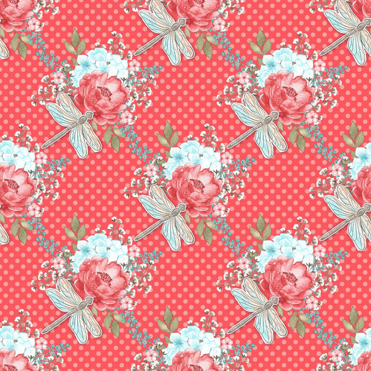 Sweet Dragonfly on Red Dots Fabric