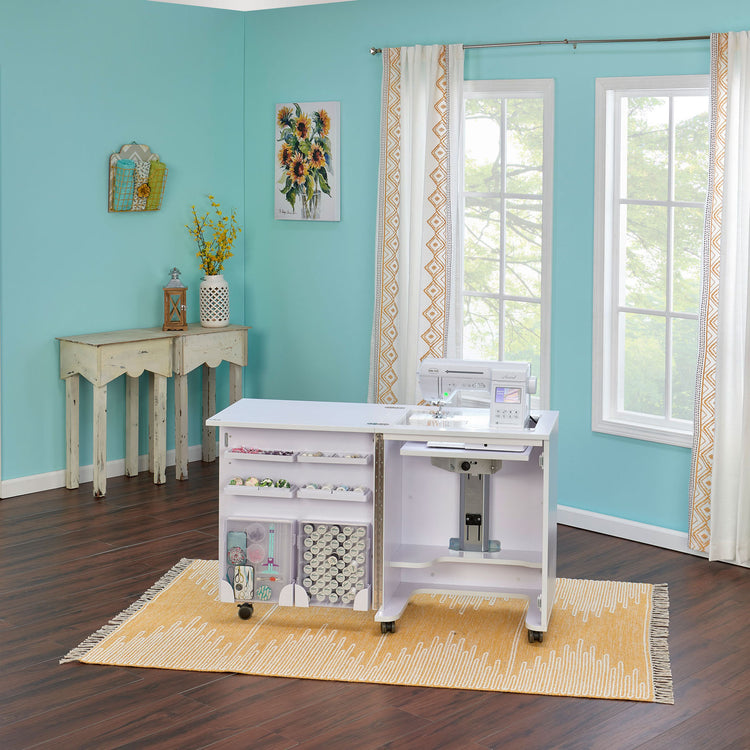 The Koala Compact Sewing Cabinet offers a smart, space-saving design that expands when you need it and tucks neatly away when you don’t. When closed, it measures 23-5/8" wide x 19-1/2" deep x 30" high, making it ideal for smaller sewing areas or multipurpose rooms. When fully opened, it extends to 47-1/4" wide (with the left leaf positioned) while maintaining the same 19-1/2" depth and 29-1/8" height, giving you extra workspace without overwhelming your room.The lift opening measures 18-7/8" wide x 11-1/4" deep, accommodating a variety of sewing and quilting machines comfortably. Compact in size yet generous in features, this cabinet brings efficiency, functionality, and elegance to any creative space.