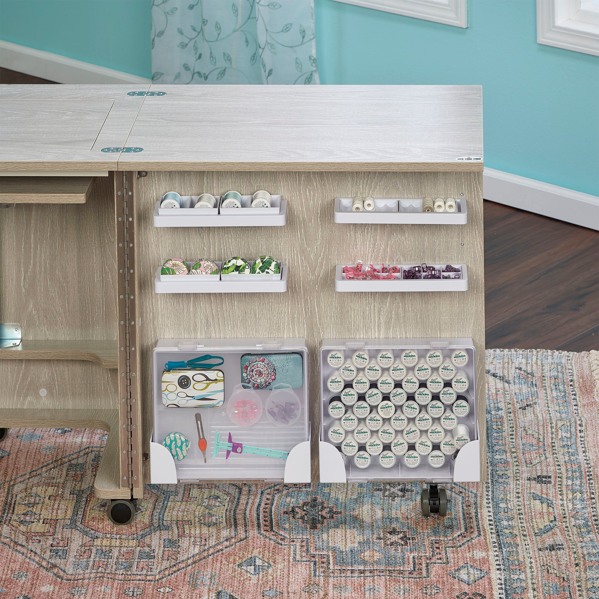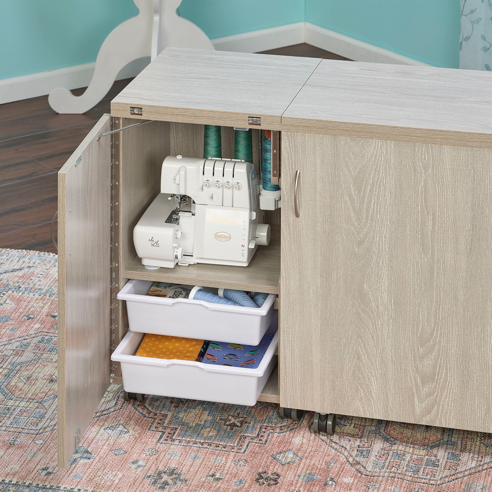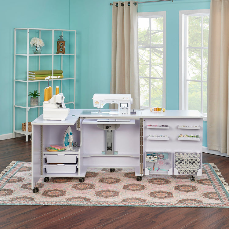 Every detail of the Eclipse is designed for efficiency and comfort. Integrated shelves and fabric bins keep your materials close at hand, while dedicated thread and accessory storage boxes make it easy to stay organized. The easy-roll, lockable casters let you reposition your cabinet effortlessly — then lock it securely in place once you’re ready to sew. Best of all, it comes fully assembled, so you can get right to creating the moment it arrives.