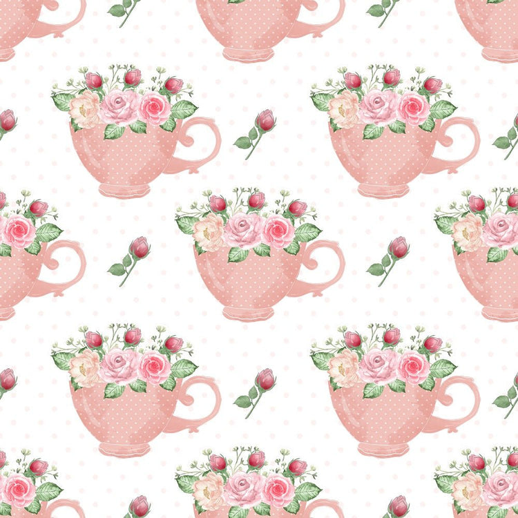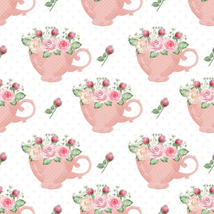 The White Tea Time Floral Cups Fabric is part of the Tea Time Fabric Collection printed by Sew Creative Fabrics. Digitally Printed on 100% cotton.