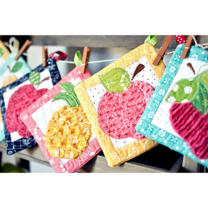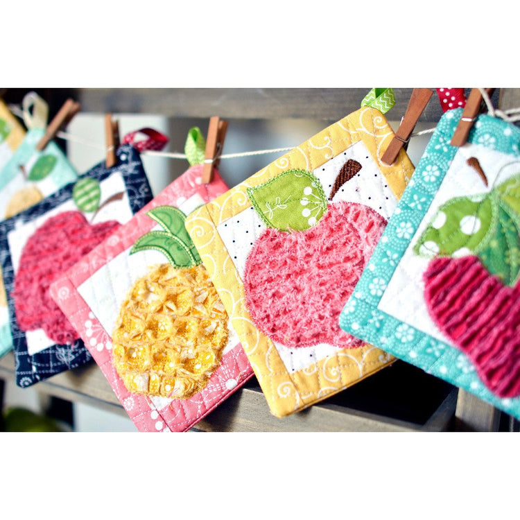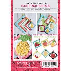 Beat the heat with these chenille fruit pot holders. The That's Sew Chenille: Fruit Stand Hotpads CD includes designs and instructions on how to make each project entirely in the hoop! That's Sew Chenille: Fruit Stand Hotpads CD includes five different sizes of pot holders that you can make and six different fruit designs.