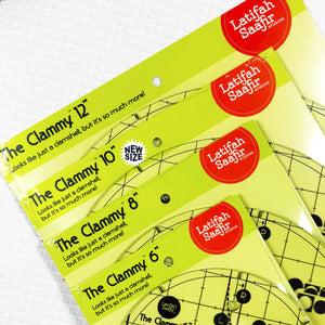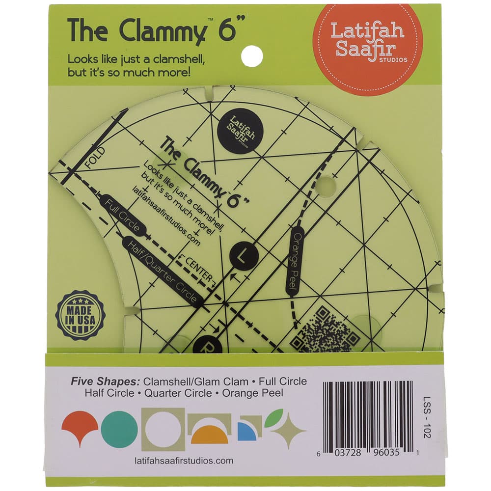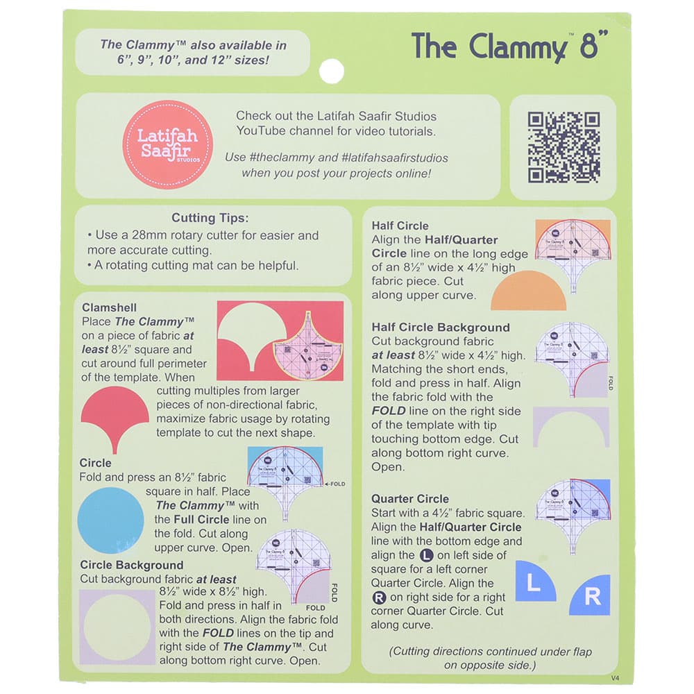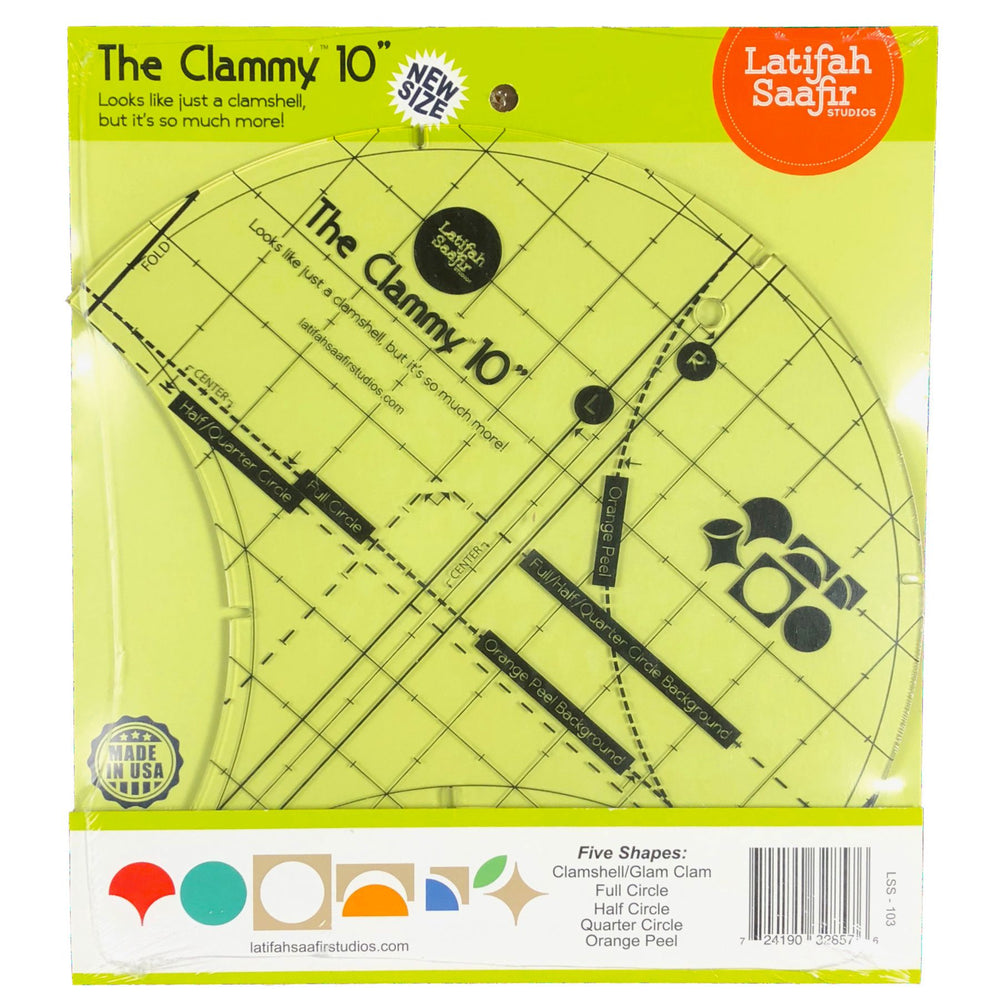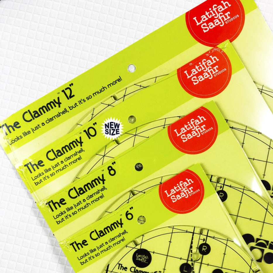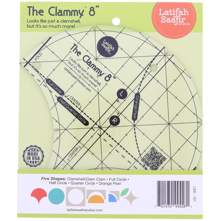 Save time, money, and effort with Latifah Saafir's template ruler, The Clammy. This ruler looks like your average clamshell, but it's so much more! It is an innovative multi-function template that can be used to cut a variety of shapes, including clamshells/glam clams, circles, half-circles, quarter-circles, and orange peels! All these shapes would normally require multiple rulers, but thanks to the Clammy, they have been condensed into one amazing tool! These new and improved Clammys include registration marks right on the template for easy transfer to your shapes! Choose from four different sized Clammys, or bundle them and get all four. The Clammy is made right here in the USA with durable acrylic.