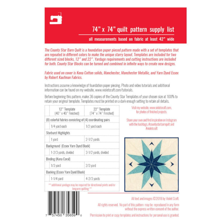 The County Star Barn Quilt is an eye-catching quilt made using foundation paper piecing. The County Star Barn Quilt can be made in two sizes 40in square using 12in blocks and 74in square using 22in blocks. Create your own intricate designs by turning and combining each block however you choose. The County Star Barn Quilt Pattern includes templates for each size quilt. Fabric requirements can be found in the product images.