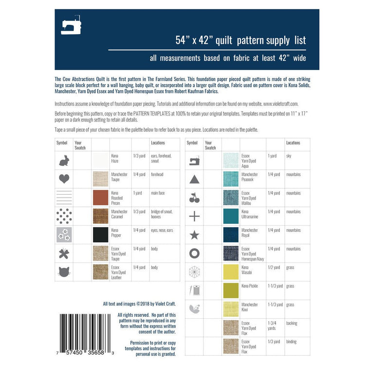 Make this adorable quilt pattern to decorate your home or to give as a gift. The Cow Abstraction Quilt finishes to 54 inches wide by 42 inches tall and is made using foundation paper piecing. The pattern includes a template that can be duplicated for multiple uses. For fabric requirements, see images.