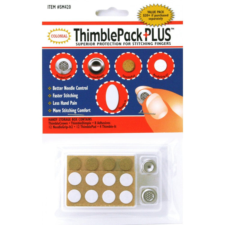 Protect your fingers from annoying needle pricks with a Thimble Pack Plus. Included in the Thimble Pack Plus are a thimble crown, thimble dimple, 12 thimble pads, 4 thimble-it pads, 12 needle grip-it pads, and 8 adhesive pads. Keep all of the pieces of your Thimble Pack Plus neat and organized in the included storage box.