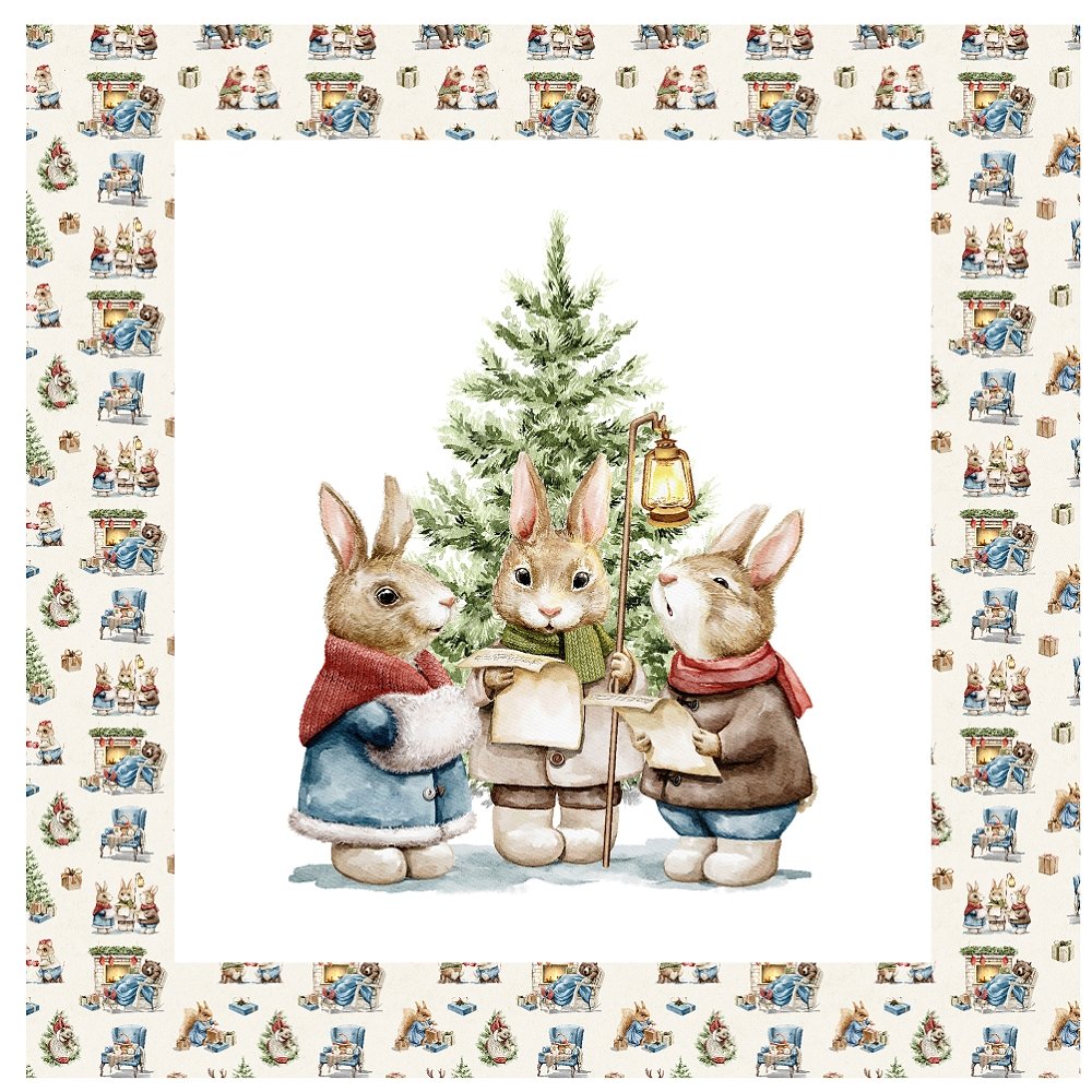 Three Caroling Bunnies Fabric Pillow Panel - Cream