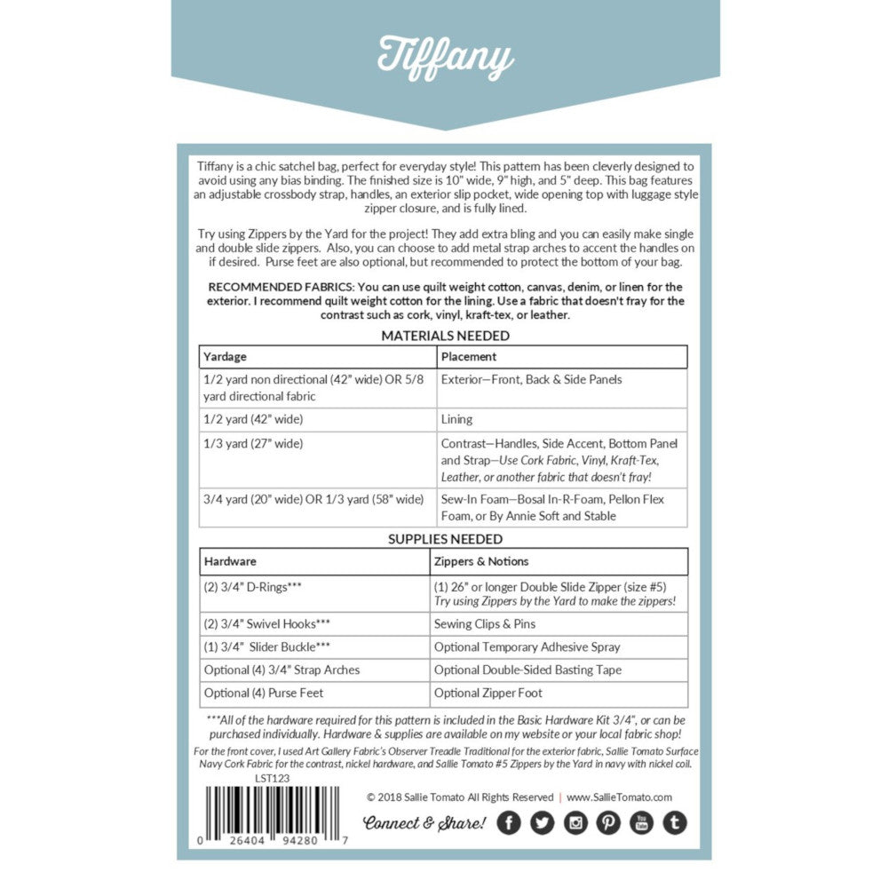 The Tiffany Satchel Pattern is large enough to store everything you will need when out and about. Wear this bag over your shoulder or across your body. An exterior slip pocket, as well as a wide opening top with luggage-style zipper closure, is featured in this pattern. Add purse feet to help protect the bottom from becoming damaged, or include strap arches to embellish your bag. The fully lined Tiffany Satchel Pattern finishes to 10" wide by 9" high and 5" deep. Instructions and graphics are included to help make the pattern easier to complete.