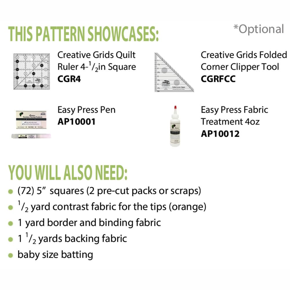 The Cut Loose Press, Tip-Top Baby Quilt Pattern is an excellent design to learn to set a quilt on point. With only 72 5" squares and a 1/2 yard of contrasting fabric, you can create this adorable quilt in just one day! The 4-1/2" Square Creative Grids Quilting Ruler and the Creative Grids Folded Corner Clipper Tool are required to complete this project. The Tip-Top Baby Quilt Pattern includes detailed instructions and suggested materials.