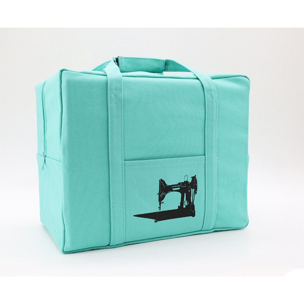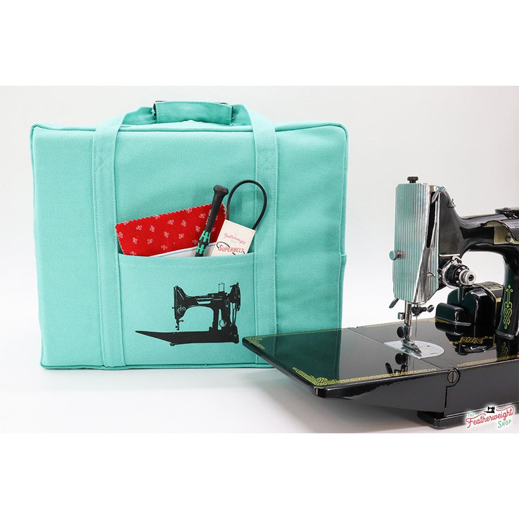 This canvas Featherweight Case Tote Bag is ideal for carrying your machine! It protects your case exterior from scratches, and it makes it easier to carry if your case has a damaged handle or if clasps and latches are missing. This durable bag is made using 20oz. reinforced canvas with bound seams, a velcro-grip handle that makes it easy to hold, and useful side pockets. The Tote Bag for Featherweight Case measures 14-1/2" wide by 12" tall and 8-1/2" deep. *Please note this tote is designed to fit vintage cases and it will NOT fit reproductions. Notions pictured are not included.