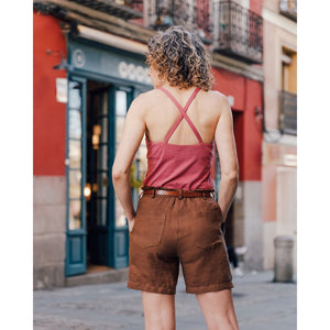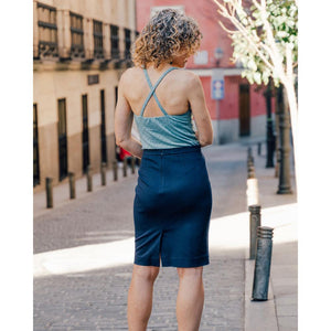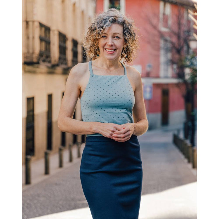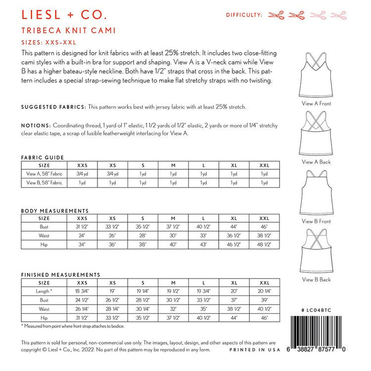 The Tribeca Knit Cami Pattern is designed for knit fabrics with at least 25% stretch. It includes two close-fitting cami styles with a built-in bra for support and shaping. View A is a V-neck cami, while View B has a higher bateau-style neckline. Both have 1/2" straps that cross in the back. This pattern includes a special strap-sewing technique to make flat stretchy straps with no twisting. You can recreate this pattern in sizes ranging from XXS to XXL.
