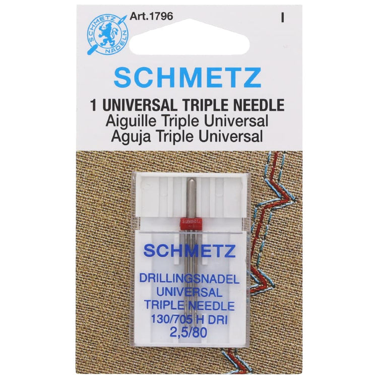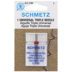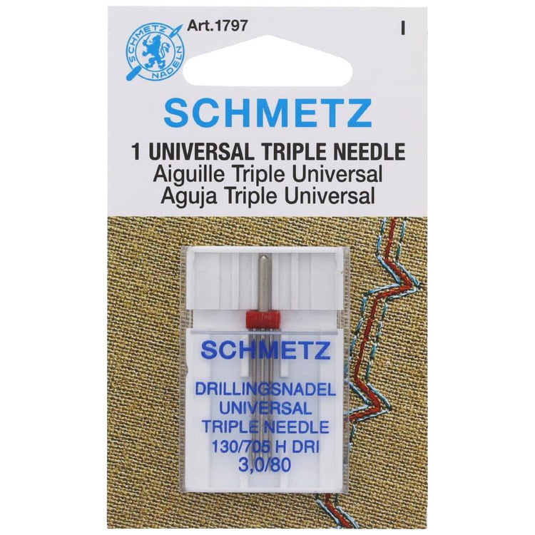 Schmetz 130/705 H DRI Triple Universal Needles are constructed with three needles mounted on a single shaft. These needles can be used with zig-zag sewing machines that thread front to back. The triple needle creates three rows of stitches simultaneously. There is only one triple needle per pack. Please Note: In order to use a Triple Needle, your machine must have a front or top loading bobbin, a zig-zag stitch, AND the flat side of the needle shank facing the back of your machine.