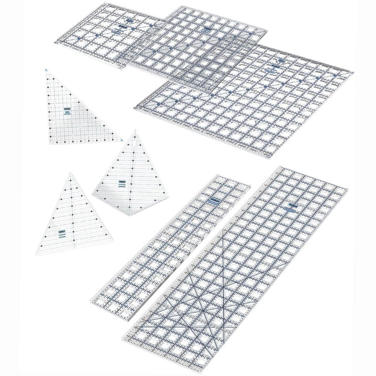 You need a serious ruler set for the serious quilter and the TrueCut Master Ruler Combo delivers on that promise. TrueCut Rulers feature built-in holes for easy measuring, marking, and holding. All of the rulers have easy-to-read measurement marks in 1/8" increments but are labeled in 1/4" and 3/4" marks. The rectangular rulers feature 30 °, 40 °, and 60 ° marks, while the square rulers have a 45 ° angle line with numbered inch marks. This eight-piece set includes a 6.5" x 6.5" Ruler, 9.5"x 9.5" Ruler, 12.5" x 12.5" Ruler, 3" x 18" Ruler, 6.5" x 24.5" Ruler, Equilateral Ruler, Kite Ruler, Right Triangle Ruler.