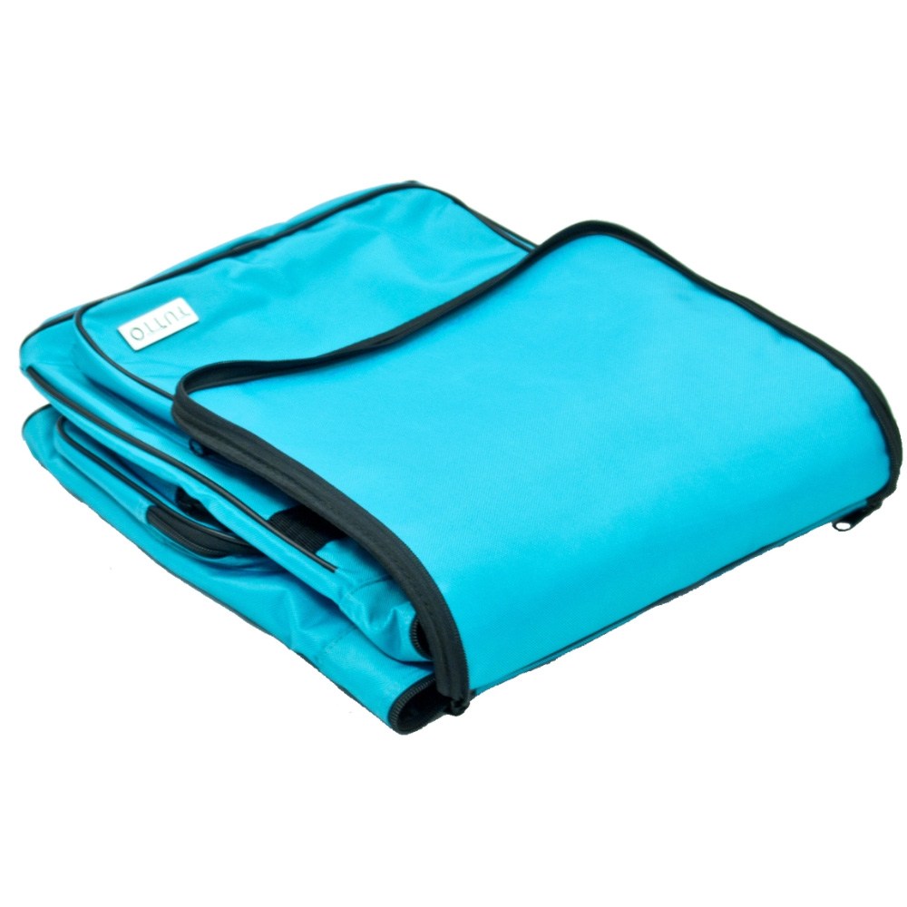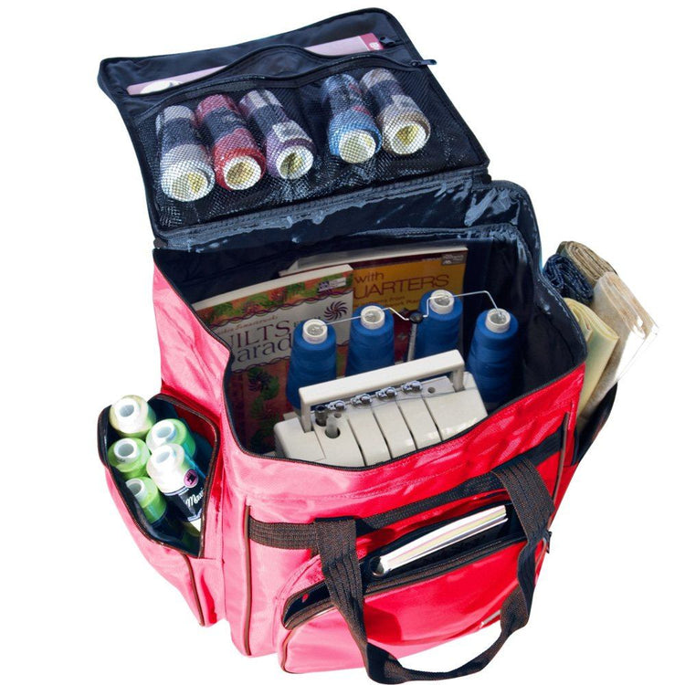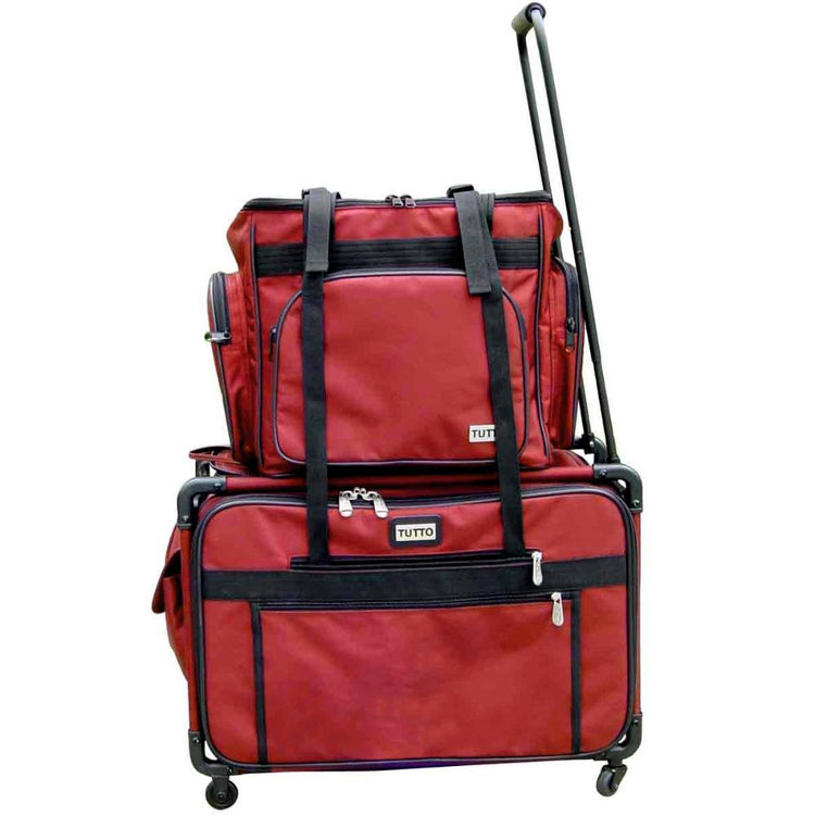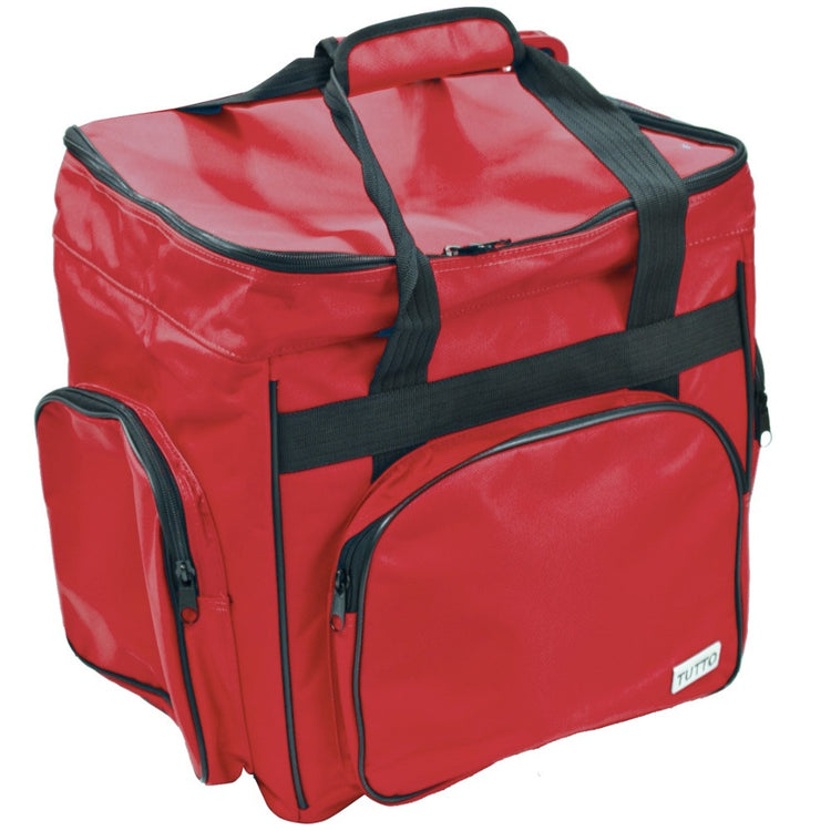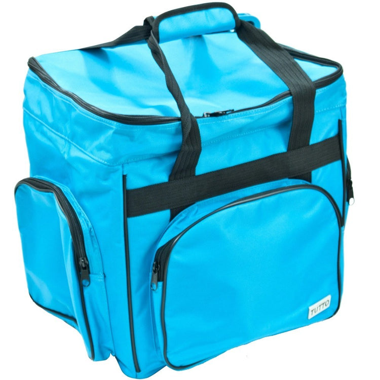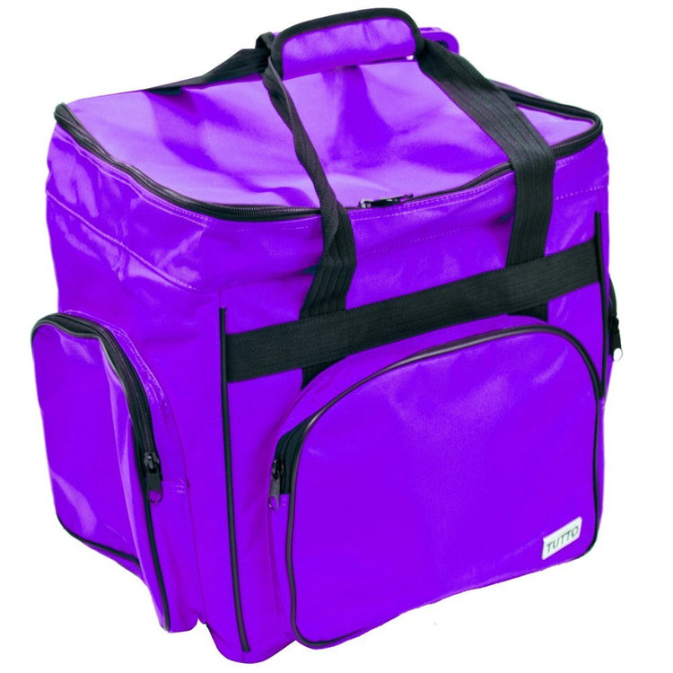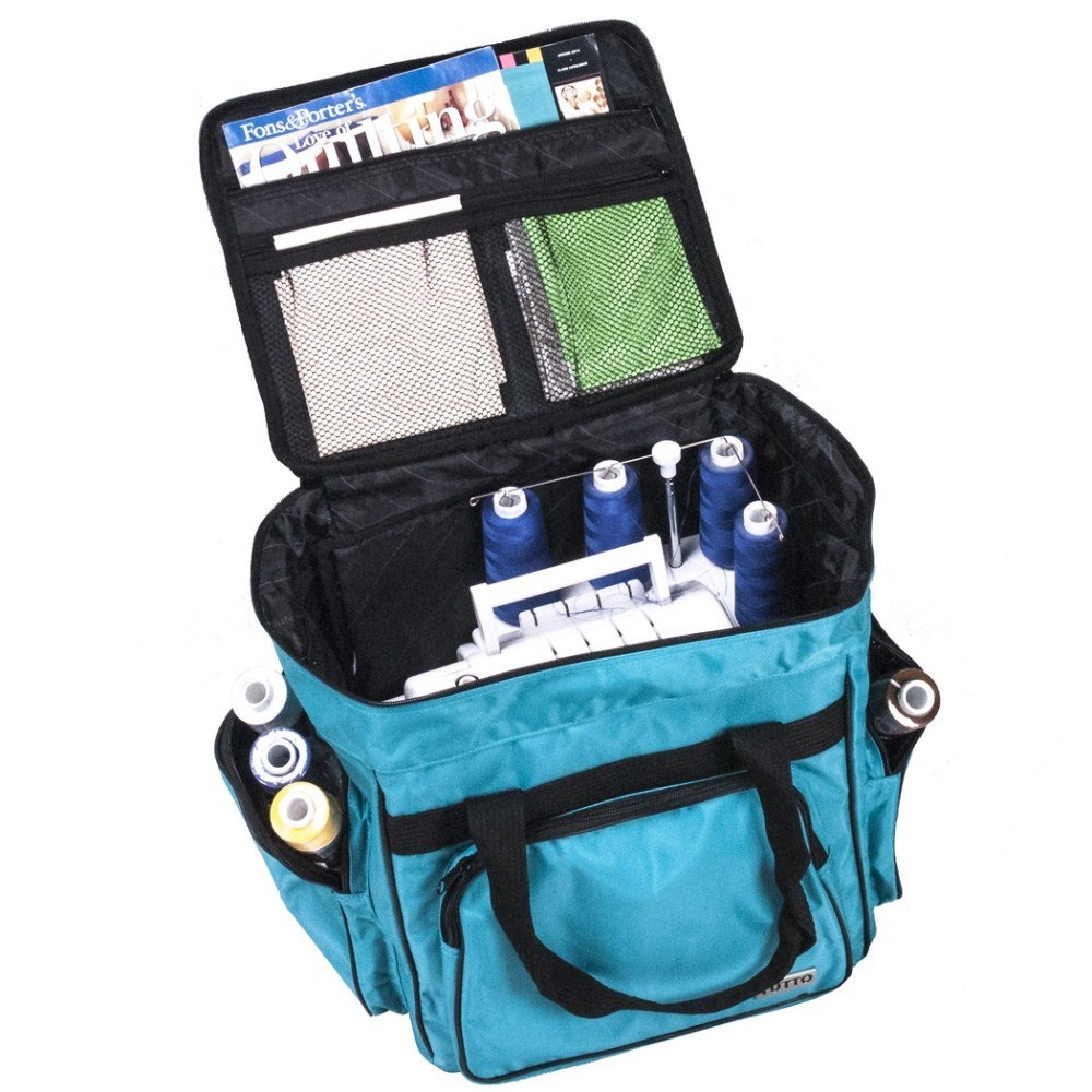 These versatile carrying cases are ideal for sewists on-the-go as well as travelers. Measuring 14-1/2in long by 14-1/2in high by 10-1/2in deep, this padded carrying case is ideal for storing and transporting your serger or small sewing machine. When your Tutto case is not in use it can be folded up for easy storage. Padded walls protect your machine and equipment; while sturdy, nylon straps make transporting safe and easy. All your notions, sewing supplies, and tools can be carried with your machine in the many side pockets. Carry your accessory serger bag independently or stack it on any Tutto wheeled case for easier transportation.