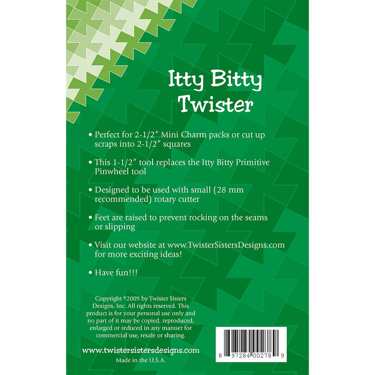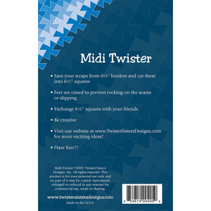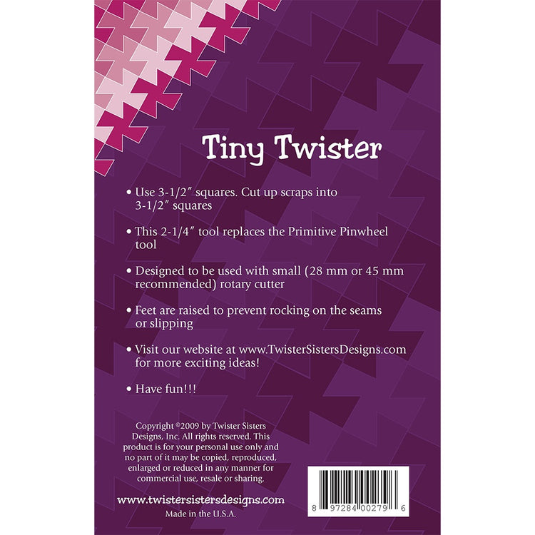 The Twister Quilting Ruler allows you to create pinwheels by sewing squares together! It eliminates the need for templates and tracing while preventing slipping and frustration. The Twister Pinwheel is made using durable acrylic and has raised feet for easy placement. Each Twister Tool includes detailed instructions and a pattern that uses the ruler.
