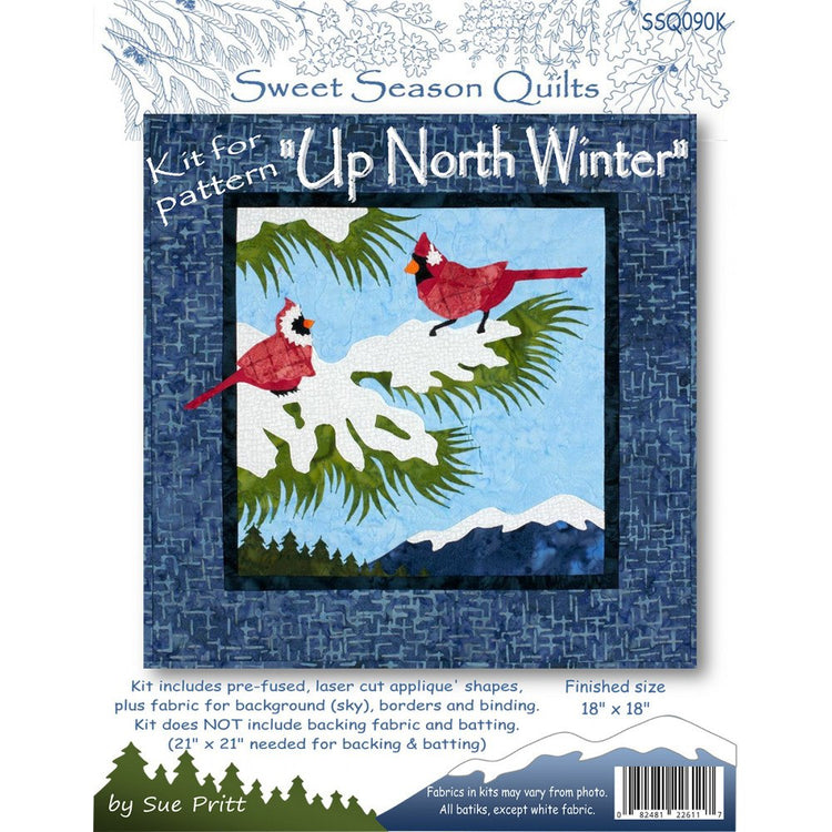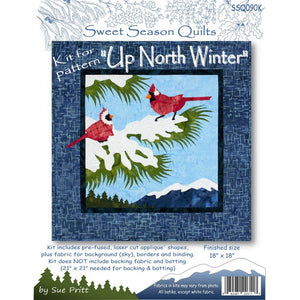 The Up North Winter Mini Quilt is designed by Sue Pritt. The Quilt Kit includes pre-fused applique shapes that have been laser cut and all fabrics for the background, borders, and binding. (Backing and batting sold separately.) Make your own festive wall quilt this Christmas; featuring cardinals on a snowy evergreen branch. The Up North WInter Quilt finishes to 18 inches square.