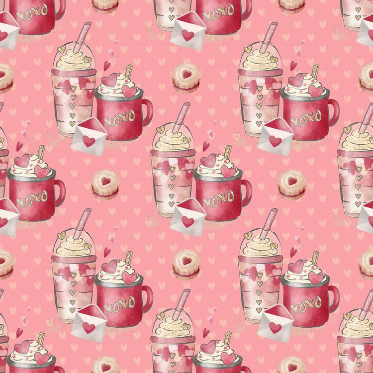Valentines Coffee on Tan Hearts Fabric - Pink