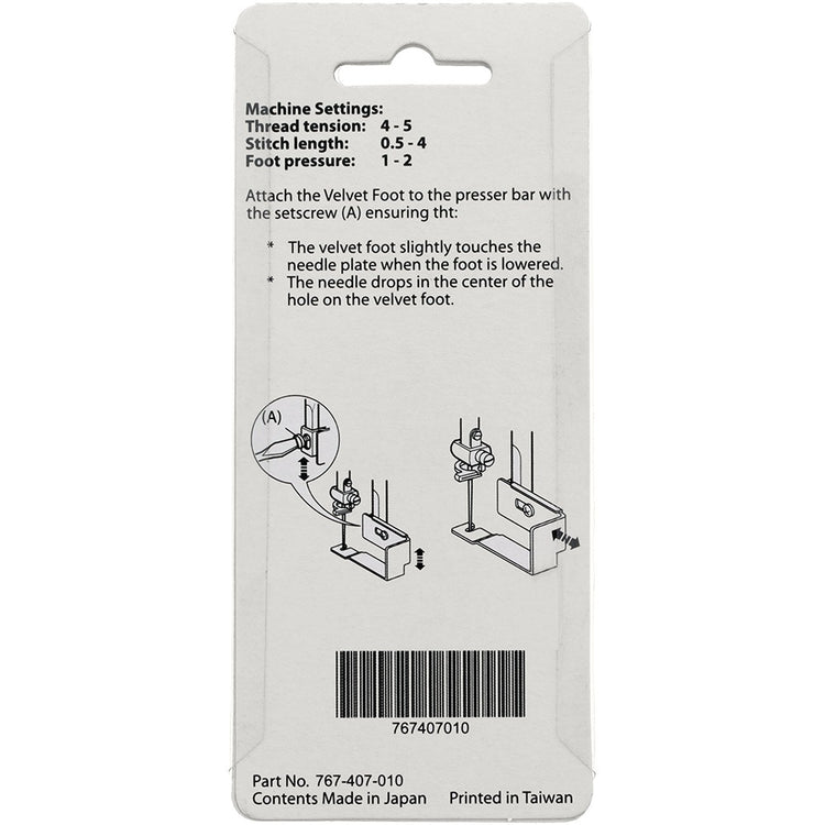 The velvet foot only slightly touches the needle plate when the foot is lowered to obtain perfect sewing without bruising the specialty fabrics.