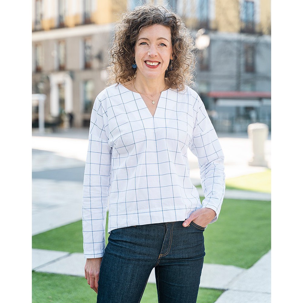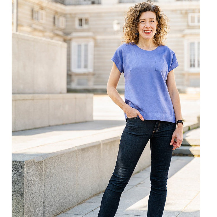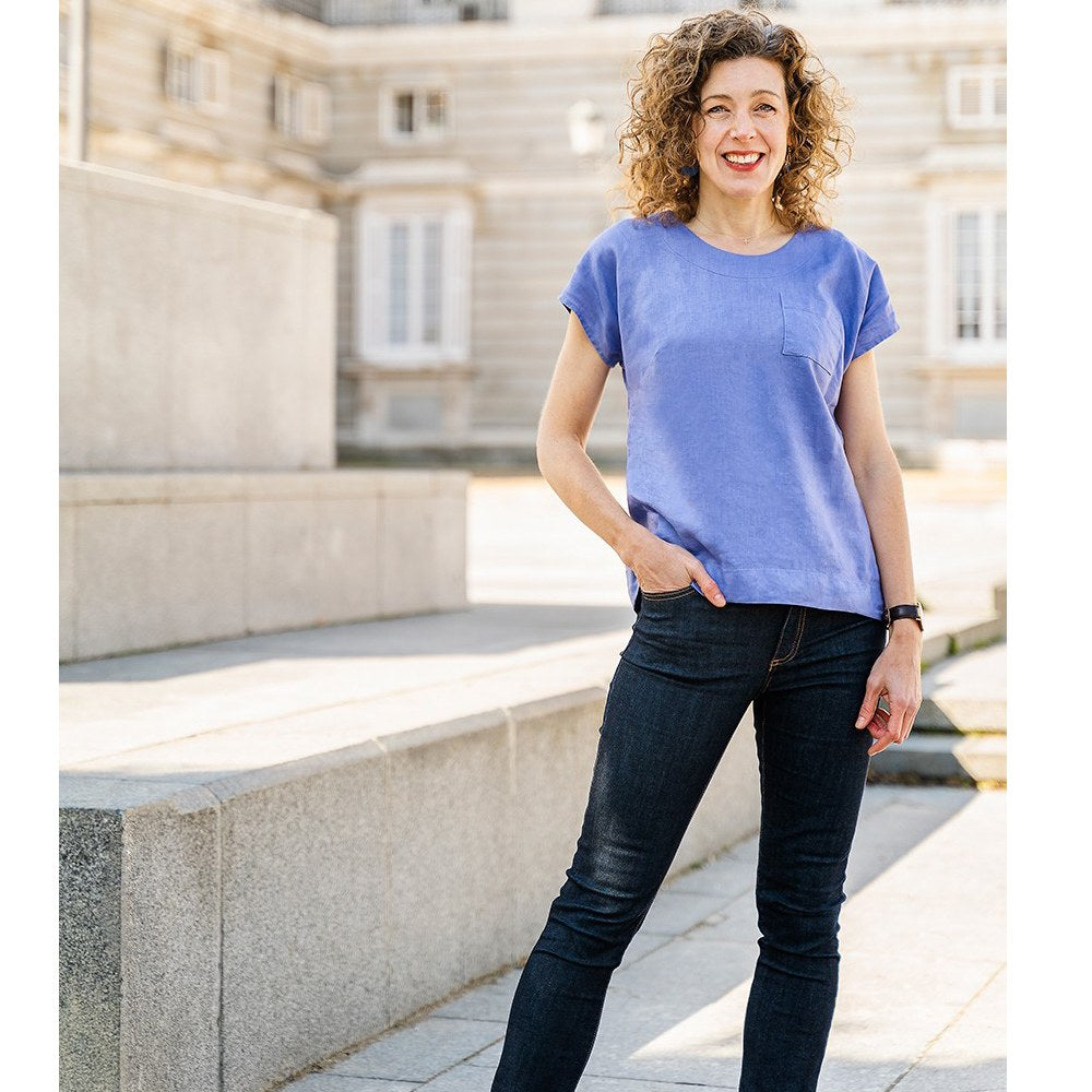 The Verdun Woven T-Shirt Pattern makes a relaxed-fit woven T-shirt with dropped shoulders, a flattering shape, a faced hem that is longer in the back than in the front, and a scooped neck with facing. View A includes cut-on short sleeves and a front pocket, while View B has a V-notched neckline and long sleeves. To aid you in finding the best fit, the Verdun provides cup sizes. The pattern includes sizes ranging from XS to XXL and works best with lightweight woven fabrics like linen, cotton lawn or voile, quilting cotton, and rayon.