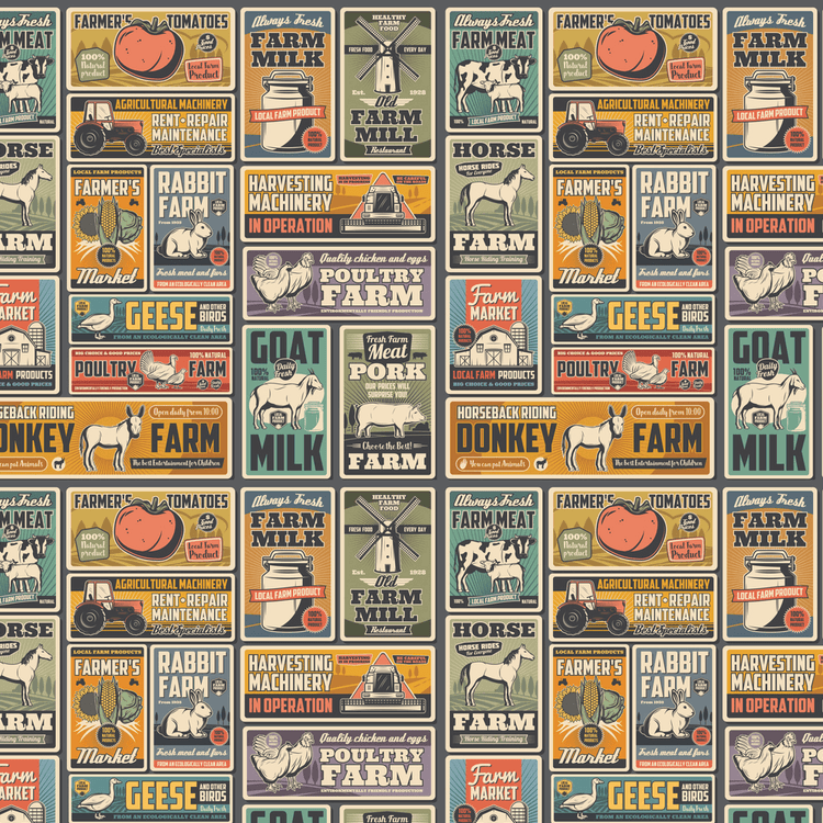 The Multi-Colored Vintage Farm Poster Fabric is part of the Vintage Posters Fabric Collection printed by Sew Creative Fabrics. Digitally Printed on 100% cotton.