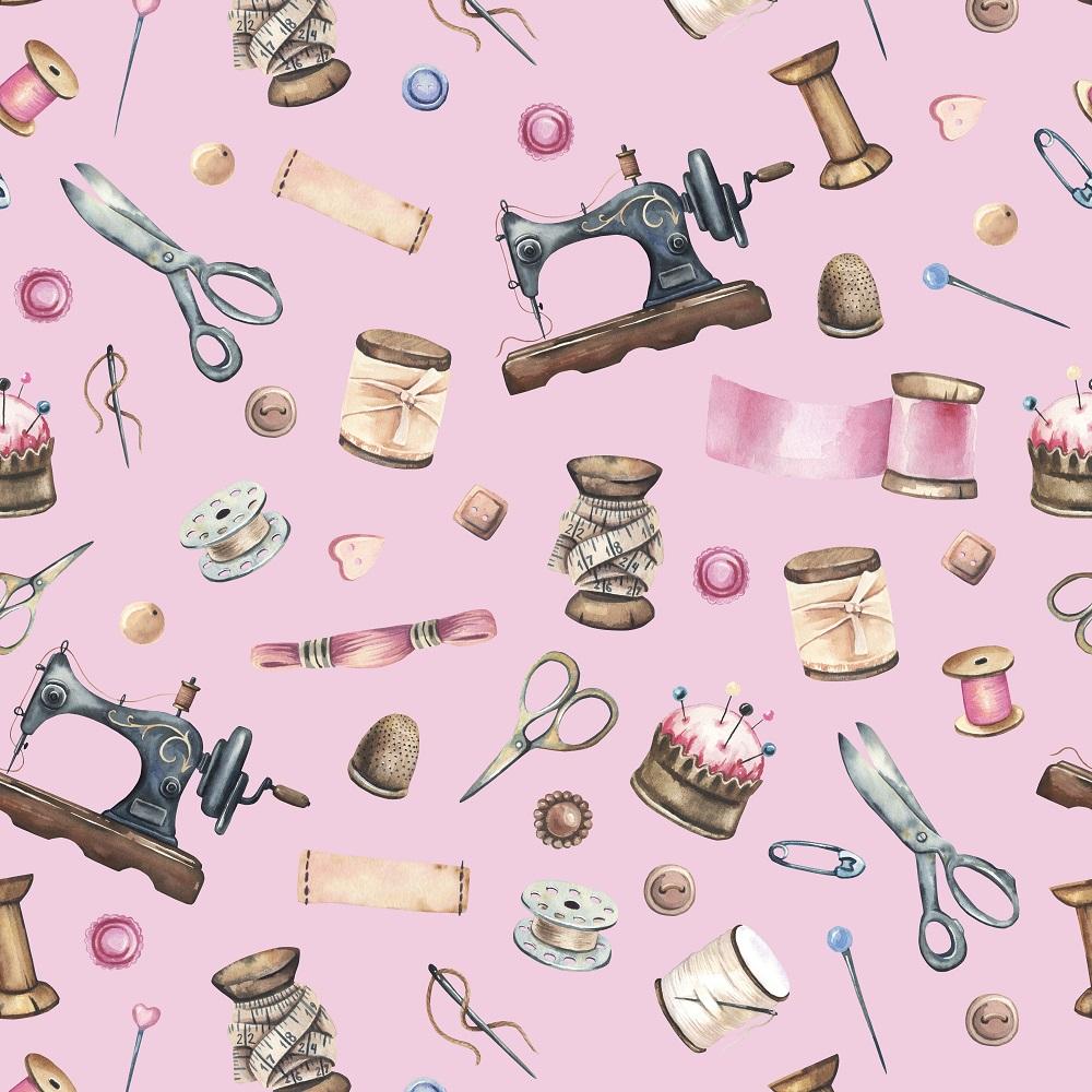Vintage Sewing Machine & Notions Fabric - Pink