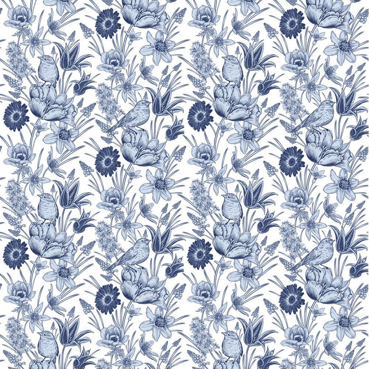 Vintage Spring Flowers and Birds Fabric - Blue/White