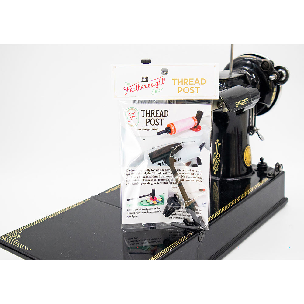The Vintage Thread Post was designed for older style sewing machines and modern spools of thread; the Thread Post converts your vertical spool pin into a horizontal thread delivery system. No more twisting and resisting! From spool to the needle, the thread will flow smoothly and evenly, providing better stitch formation. The handy tool fits the Singer Featherweight 221, 222, and many other machines with a vertical spool pin. (e.g. Singer 15, 66, 99, 127, 128, 185, 192 Spartan, 201, 237, 327, 328, 401, 403, 404, 500, and 503 - use far right pin on Slant-O-Matic & Rocketeer models). Thread pictured is not included.