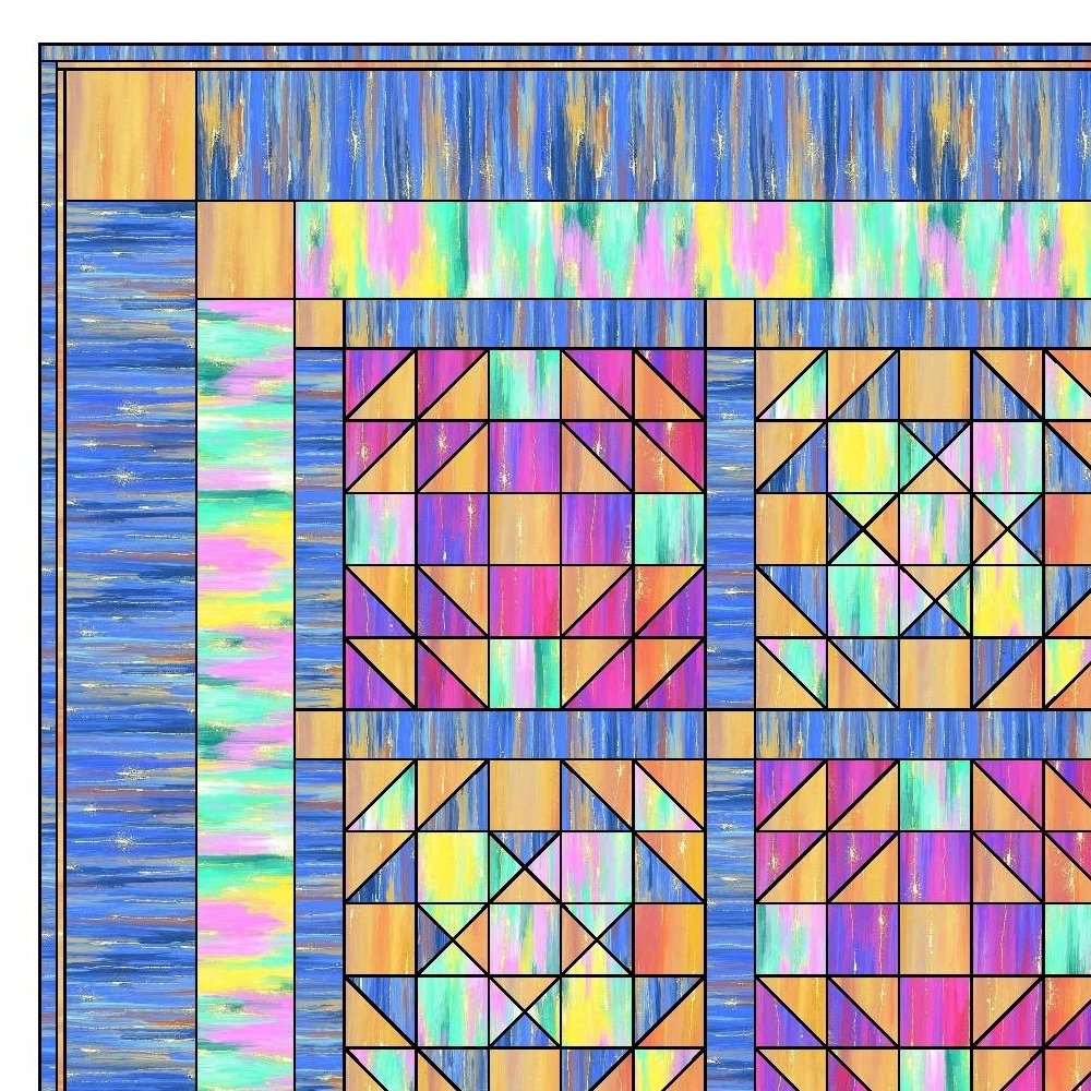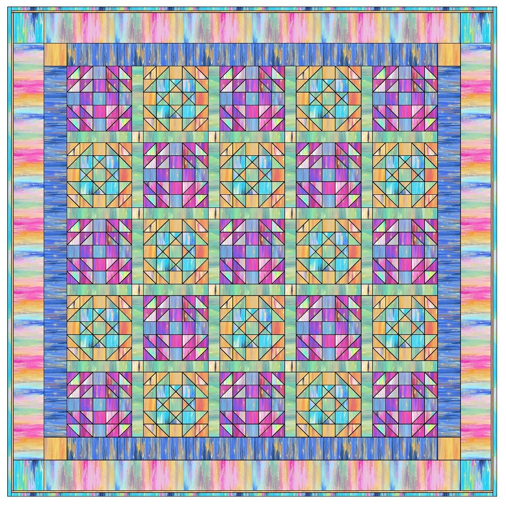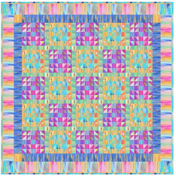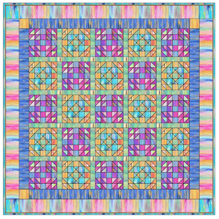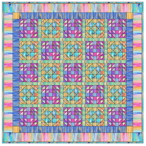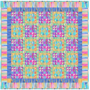 The Volume Painting Fabric Collection Quilt Kit measures 79 1/2" x 79 1/2" and includes everything you need to make the quilt - the instructions and a total of 11 yards of fabric from the Volume Painting Fabric Collection. The pattern is a grid layout of 25 blocks using Odd Scraps Patchwork Block (13) and Handy Andy Blocks (12) with sashing and cornerstones, surrounded by two borders, also with cornerstones. Digitally Printed on 100% cotton.
