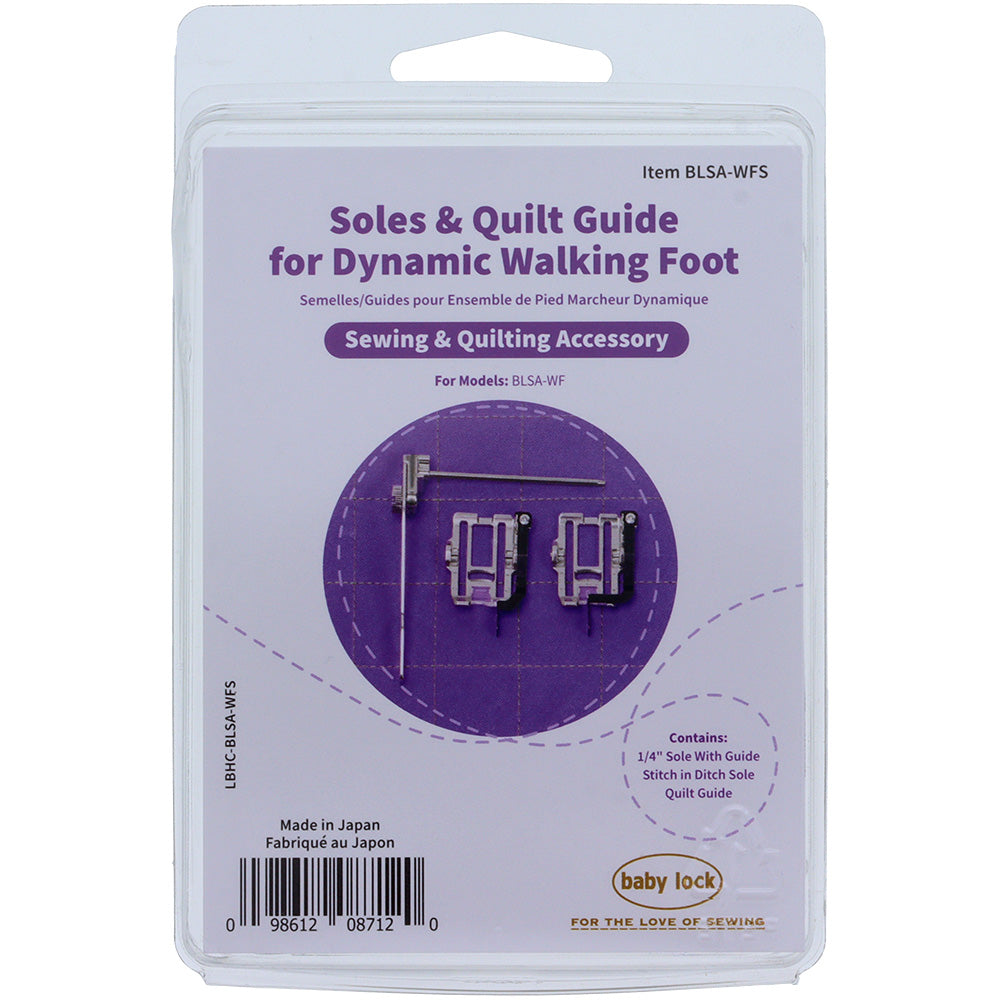 Includes one 1/4" guide sole, stitch-in-the-ditch sole, and a long quilting guide. These soles are designed to be compatible with Dynamic Walking Foot, Babylock #BLSA-WF.