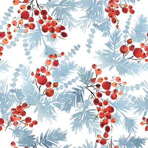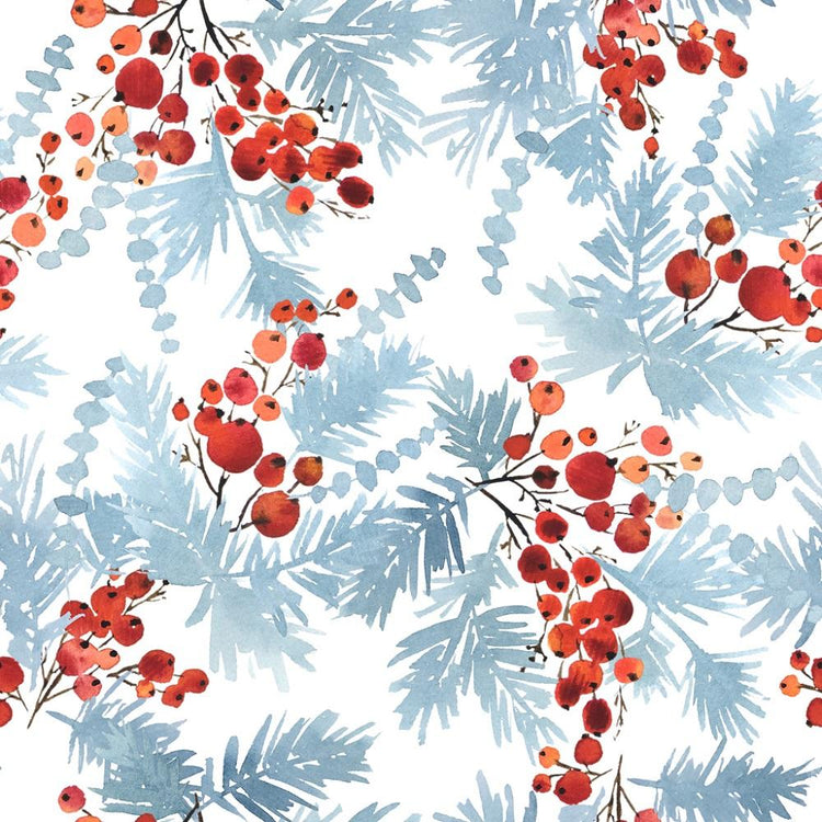 The Watercolor Blue Spruce & Red Berries Fabric is a part of the Watercolor Christmas Fabric Collection printed by Sew Creative Fabrics. Digitally Printed on 100% cotton.