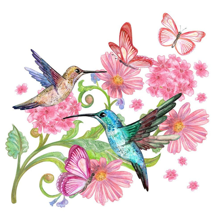 Watercolor Bright Hummingbirds & Flowers Fabric Panel Details
